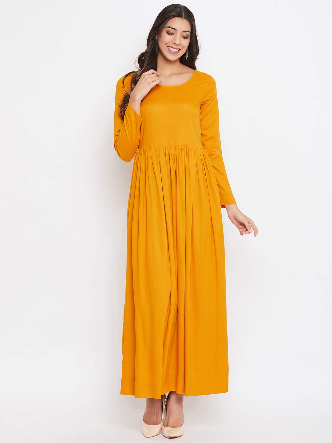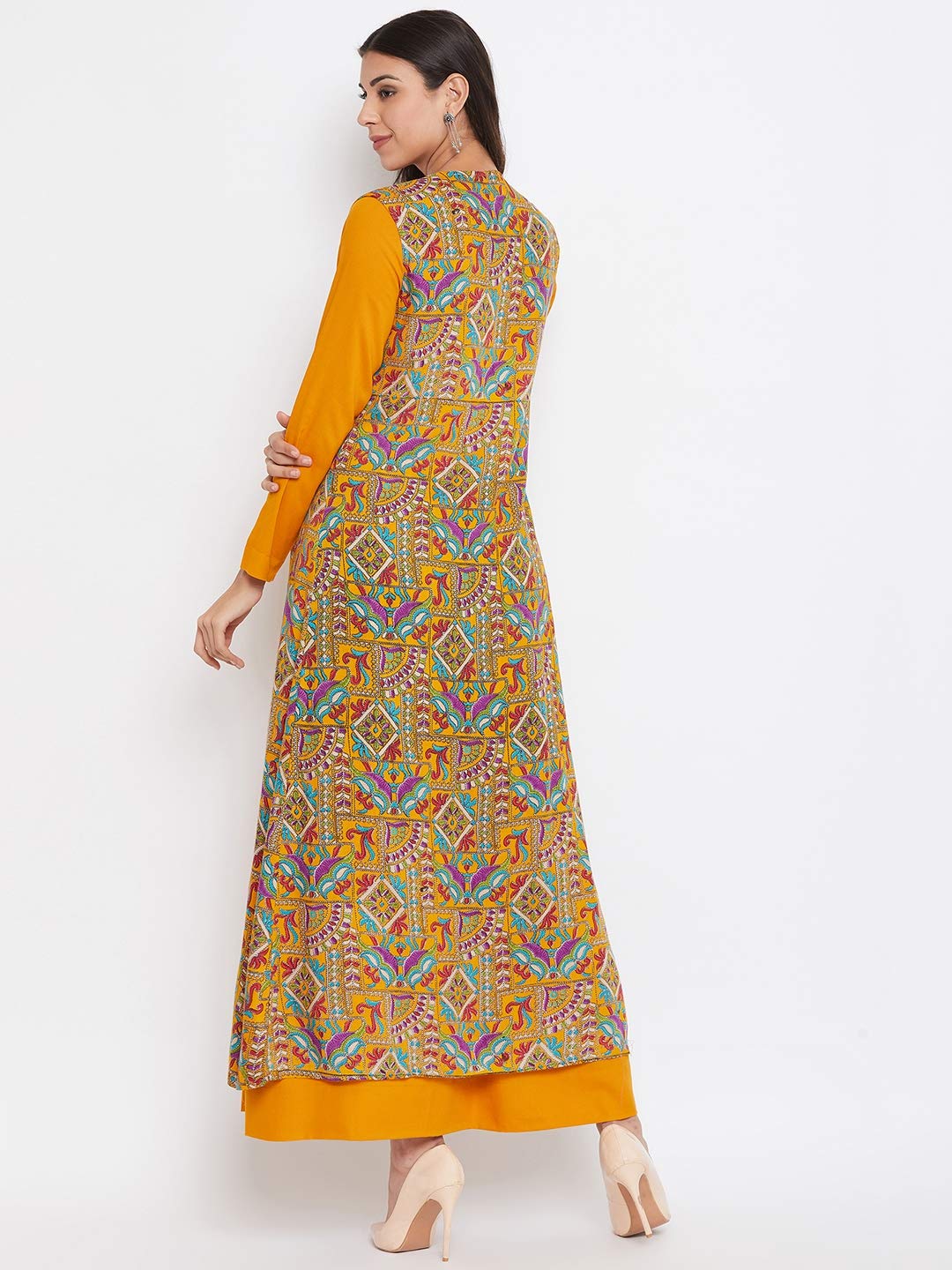 ryon maxi dress, has a round neck, full sleeves, and flared hem. An attached shrug style over the dress.