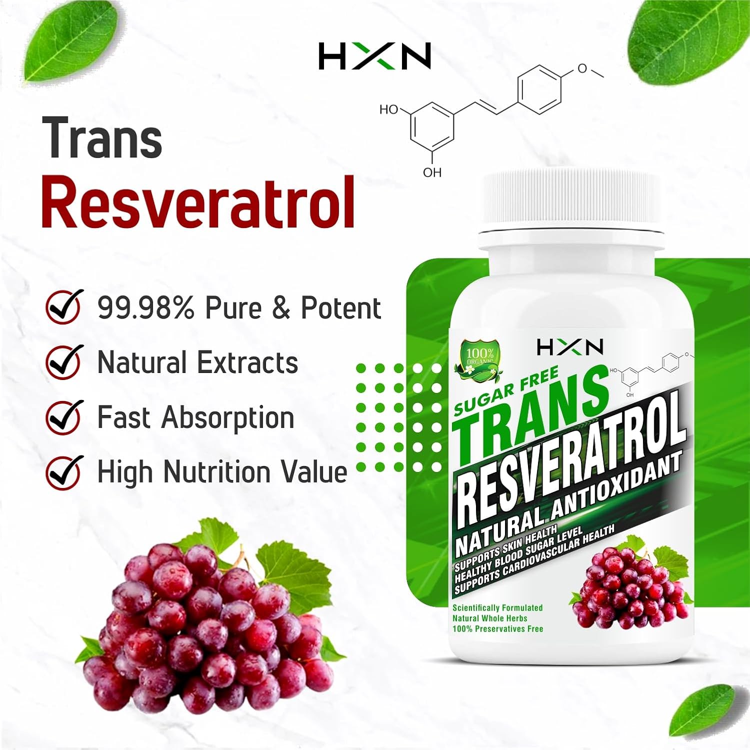 TRANS-RESVERATROL SUPPLEMENT: Our product contains Trans-Resveratrol, the most effective form of Resveratrol, ensuring you receive the maximum benefits. It is essential to have healthy blood circulation to pump nutrients and oxygen to the body.