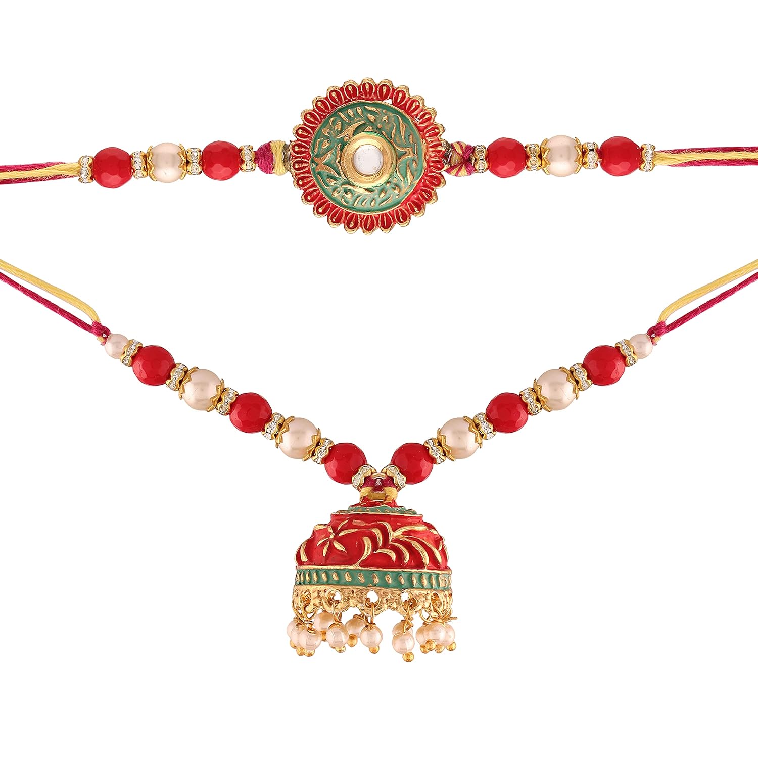 I Jewels Ethnic Meenakari Pearl Bhaiya Bhabhi Lumba Rakhi Bracelet Combo Set With Roli Chawal & Rakshabandhan Card For Unisex Adult (R049-Co)