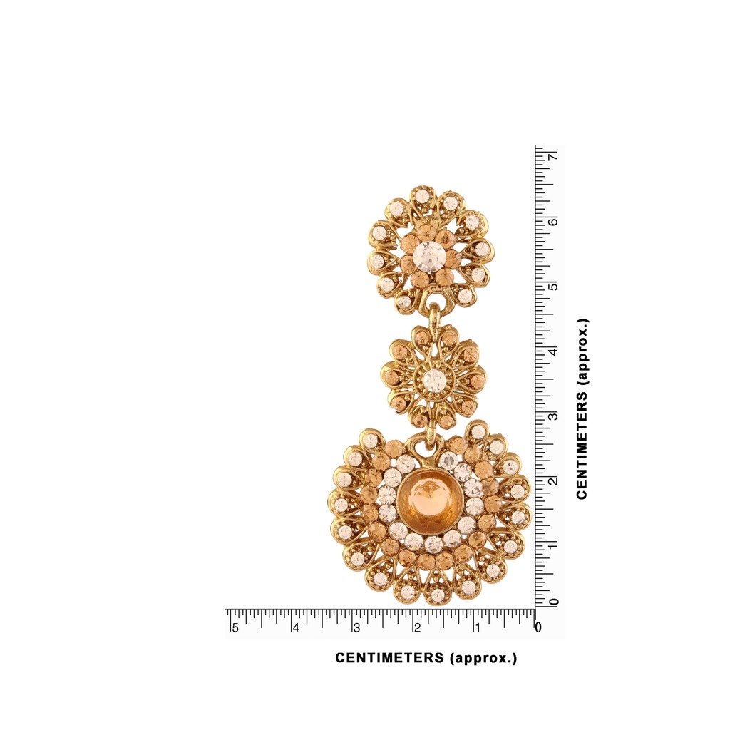 Review: I ordered it yesterday, and it has arrived today itself, thank you Amazon for your express delivery, I am a happy person!The packaging was amazing with an extra pair of stoppers. The earrings look delicate, are a lil heavy, but one can wear it comfortably without ear ache. When they arrived one small stone had come out of its nook and was inside the packet. I stuck it back with feviquick. Also applied it throughout the small stones. But in doing so the sheen gets diluted. Hence I applied some coconut oil and it’s back to shining in its full glory.They’re indeed a beautiful pair, with the right colour of gold, one can gift it or wear it during any occasion without a doubt.