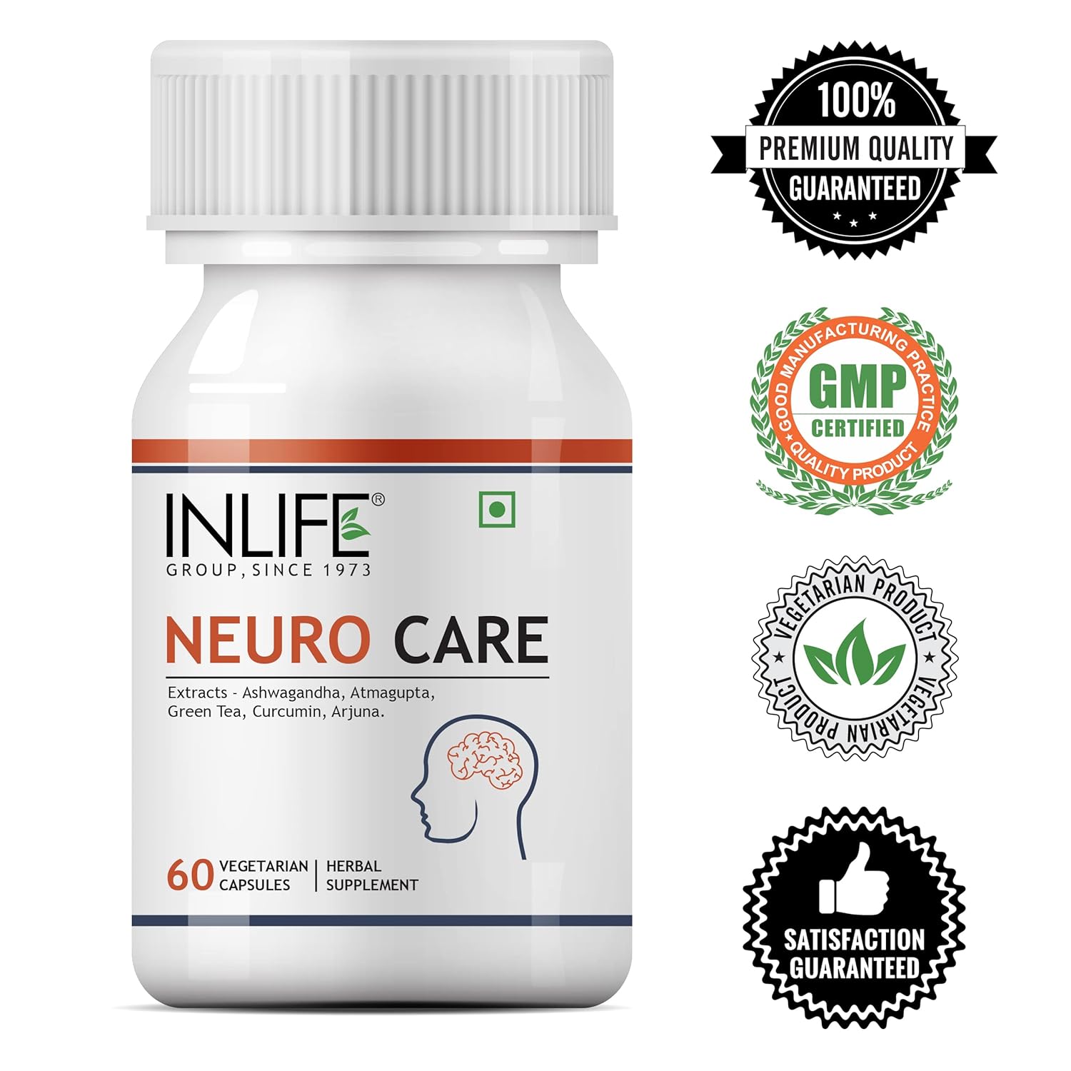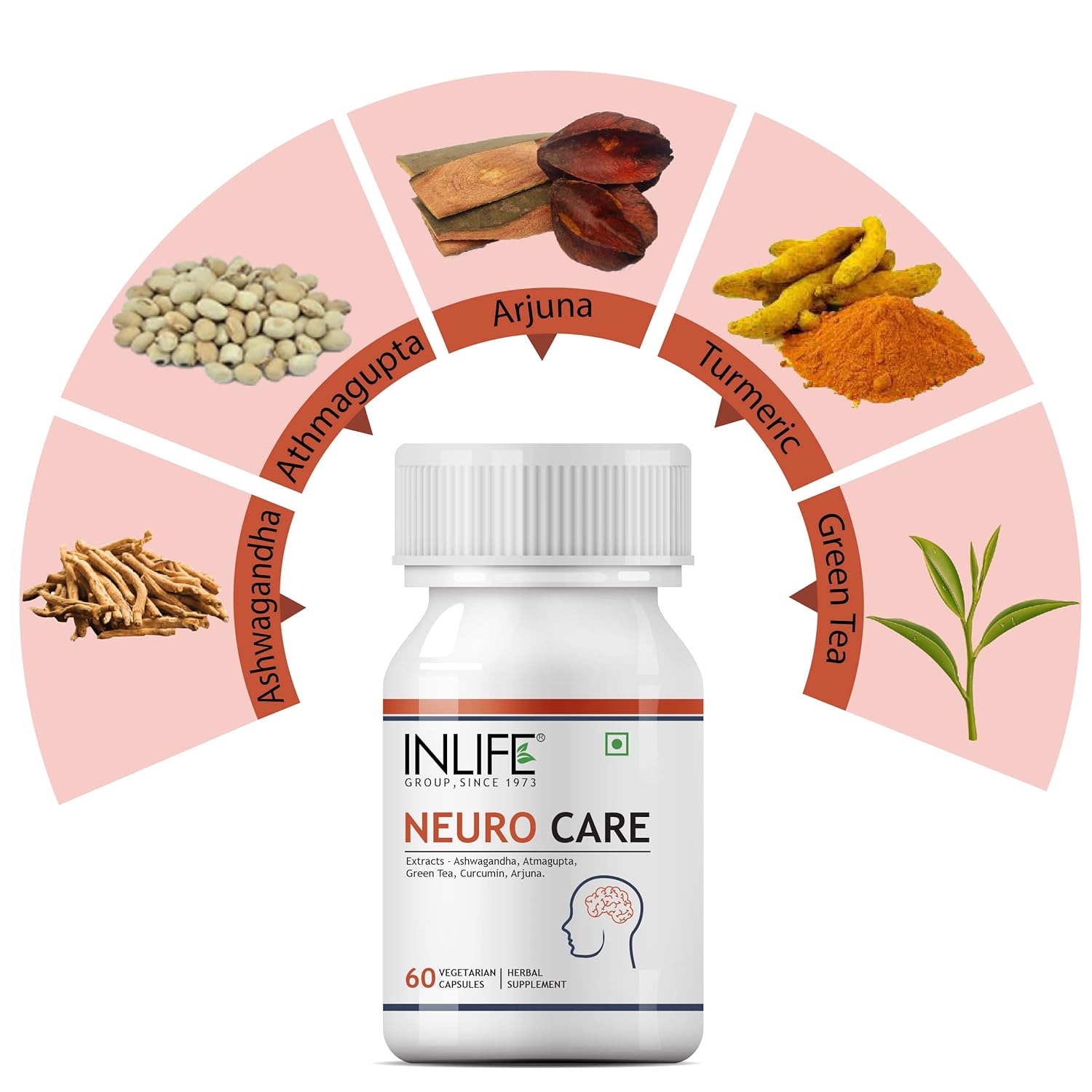INLIFE Neuro Nerve Care Health Supplement – Ashwagandha, Green Tea, Turmeric (Curcumin), Arjuna, Atmagupta Extracts 500 mg – 60 Vegetarian Capsules (Pack of 1, 60)