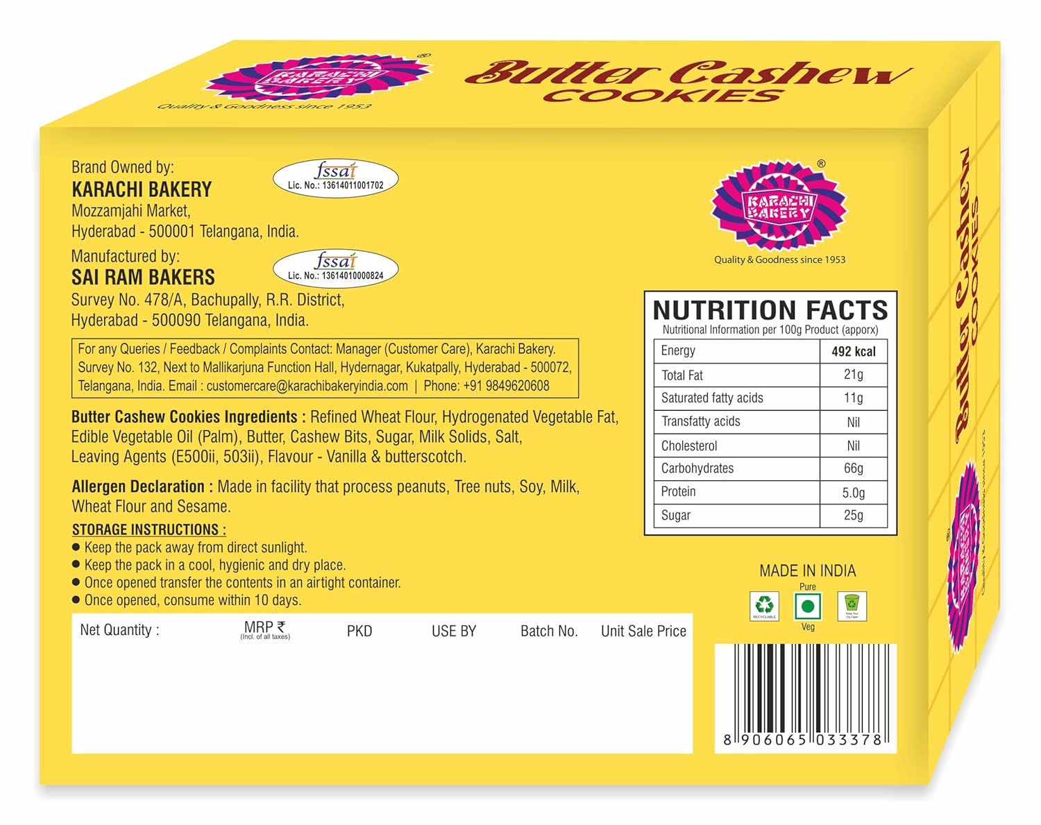 | Manufacturer | Sri Ram Bakers, Survey No 478/A/B, Qutbullapur Mandal, Bachupally, Hyderabad, Pin:- 500090; Ph No:- 9849620608 |