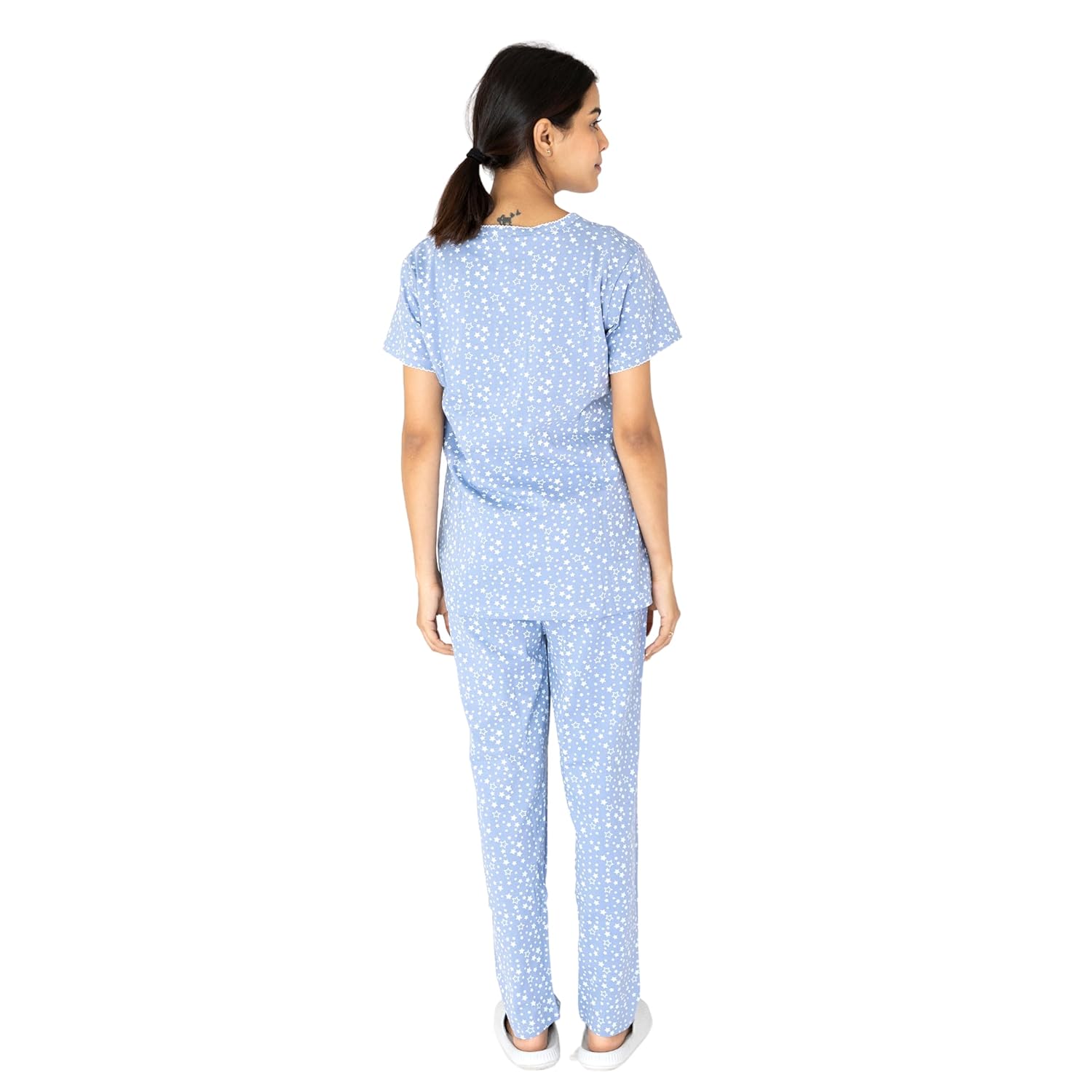 LABEL MY Women’s Nightsuit Set| Comfortable Cotton Nightwear | Round Neck Top with Three Buttons | Pyjama with Side Pockets, Elastic Waist & Drawstring