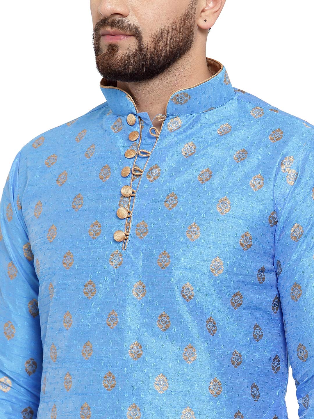 Look your ethnic best wearing this coloured Ganesh print Kurta Pyjama set for men from the fashion house of Larwa. Made from banarasi Jacquard, this regular-fit Ganesh print Kurta Pyjama set comprises a full-sleeved kurta and Pyjama to complete your look. Team this outfit with embroidered mojris and rock the party that you attend.