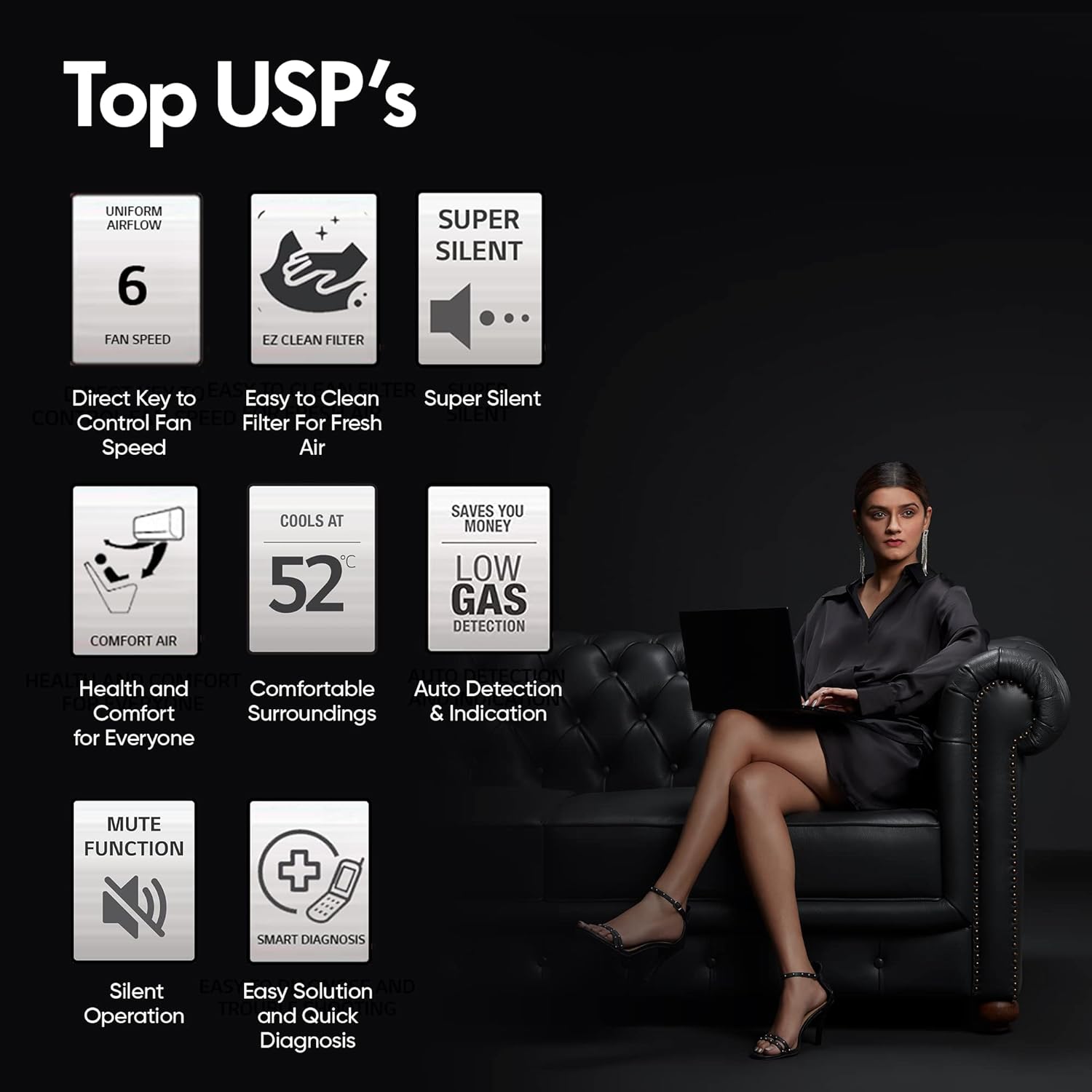Key Features: Stabilizer free operation within 120-290 Voltage range; Ocean Black Fin Anti Corrosive; Ez Clean Filter; Low gas detection; 100% Copper Condensor; 6 Fan Speed steps; Hi Grooved Copper; Smart Diagnosis System; Magic Display; Monsoon Comfort
