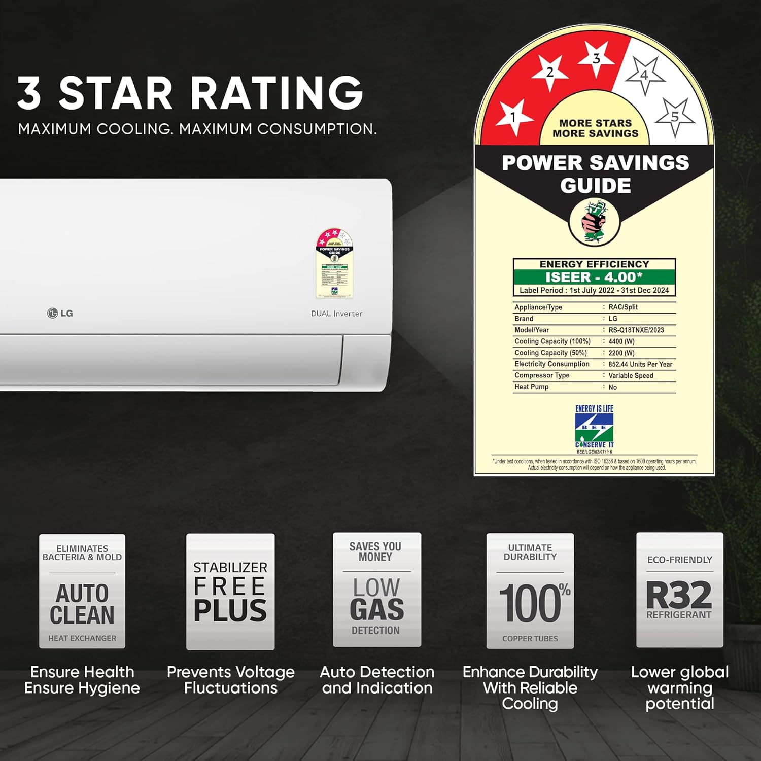LG 1.5 Ton 3 Star DUAL Inverter Split AC (Copper, Super Convertible 5-in-1 Cooling, HD Filter with Anti-Virus Protection, 2023 Model, RS-Q18TNXE, White)