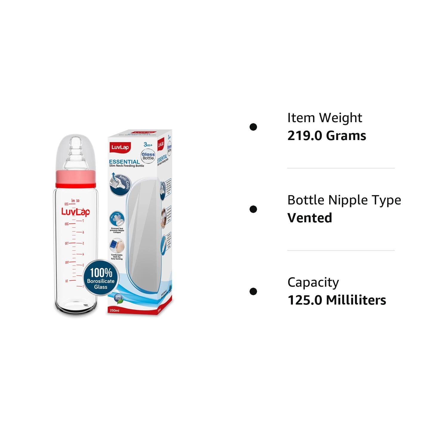 Review: The LuvLap Essential Slim Neck Glass Feeding Bottle presents a set of advantages and drawbacks that are worth considering when selecting the ideal feeding option for your baby. Here’s a comprehensive review of its pros and cons:Pros:Chemical-Free Assurance: The glass construction of the LuvLap Essential bottle ensures that no harmful chemicals are leaching into your baby’s milk or formula, providing peace of mind regarding the safety of their feeding experience.Effortless Cleaning: Glass bottles are known for their ease of cleaning, allowing you to maintain a high level of hygiene and sanitation, which is crucial for your baby’s health.Complete Sanitization: Glass’s non-porous surface makes it simple to achieve complete sanitization, minimizing the risk of bacterial growth and contamination during your baby’s feedings.Enhanced Taste: Glass bottles preserve the natural taste of the milk or formula, ensuring that your baby experiences the pure flavors without any interference from the container material.Compatibility with Breast Pumps: Glass bottles like the LuvLap Essential are often compatible with common breast pumps, making it convenient for breastfeeding mothers to express and store milk.Cons:Higher Cost: Glass baby bottles generally come at a higher price point compared to their plastic counterparts, which might impact budget-conscious parents.Limited Design Options: Glass bottles may have fewer design and style options compared to plastic bottles, which might impact personal preferences.Weight Factor: Glass bottles are relatively heavier than plastic ones, which could be a consideration when carrying them around or during extended feedings.Breakage Risk: Although glass bottles are designed to be durable, there is a slight chance of breakage if accidentally dropped, potentially leading to safety concerns.In Summary, the LuvLap Essential Slim Neck Glass Feeding Bottle offers a range of benefits that make it an attractive option for parents who prioritize safety, hygiene, and the taste quality of their baby’s feedings. The reassurance of chemical-free feeding and ease of cleaning contribute to a positive experience. However, the drawbacks, including a higher price, limited availability, and the slight risk of breakage, should be weighed against the advantages when making a decision.