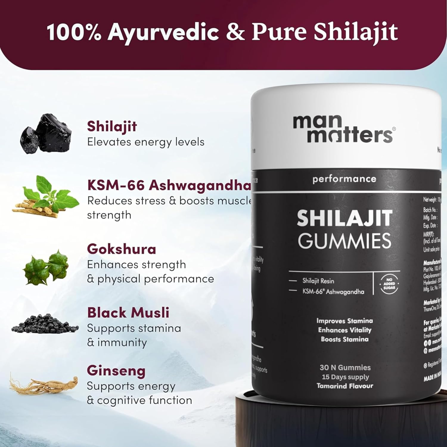 Man Matters Pure Himalayan Shilajit/Shilajeet Gummies with KSM 66 Ashwagandha | Boosts Stamina, Strength & Improves Energy Levels | No Added Sugar | Pack of 30