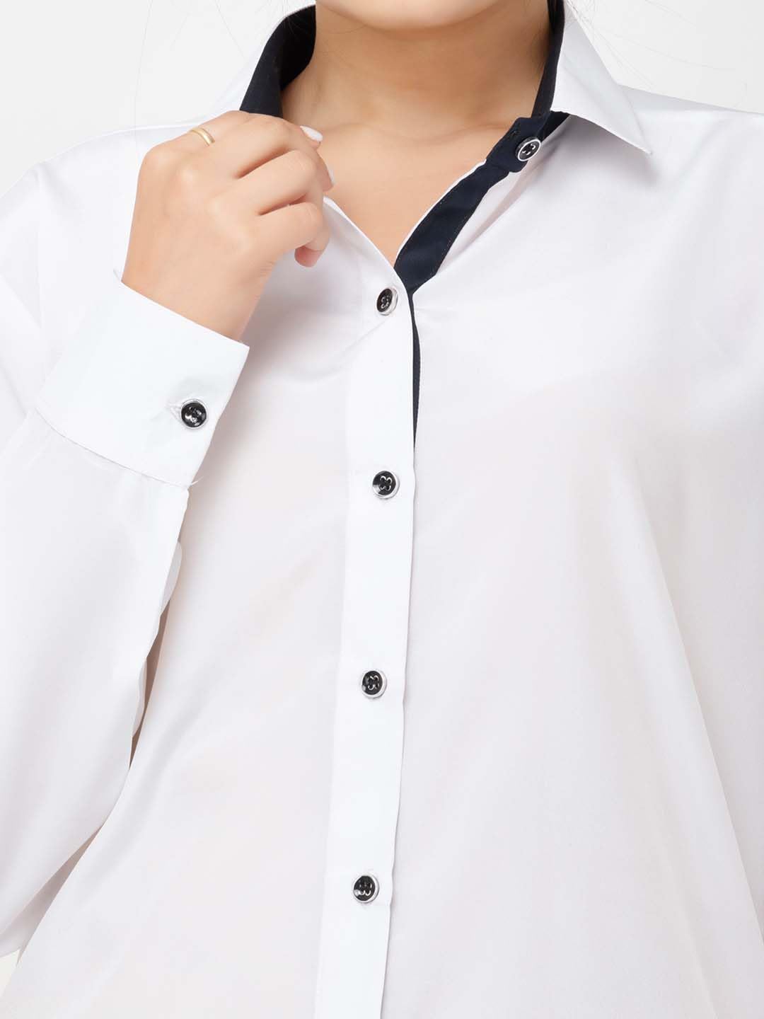 Color: The shirt is primarily white with contrasting black buttons.Collar: It features a standard collar with a slightly darker inner lining that adds a subtle contrast to the shirt.Buttons: Buttons run down the front, adding a stylish contrast against the white fabric.Sleeves: Long sleeves with buttoned cuffs, which is typical for a classic, versatile shirt.Fit: The shirt appears to have a relaxed or slightly loose fit, offering comfort while maintaining a tailored look.Length: It seems to be a regular length, suitable for wearing tucked in or out, depending on the desired style.