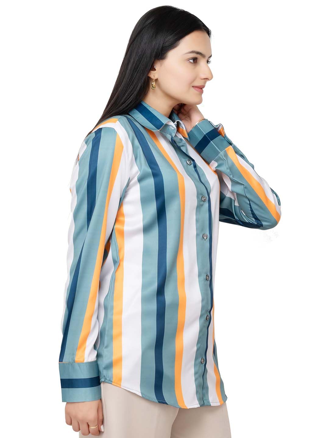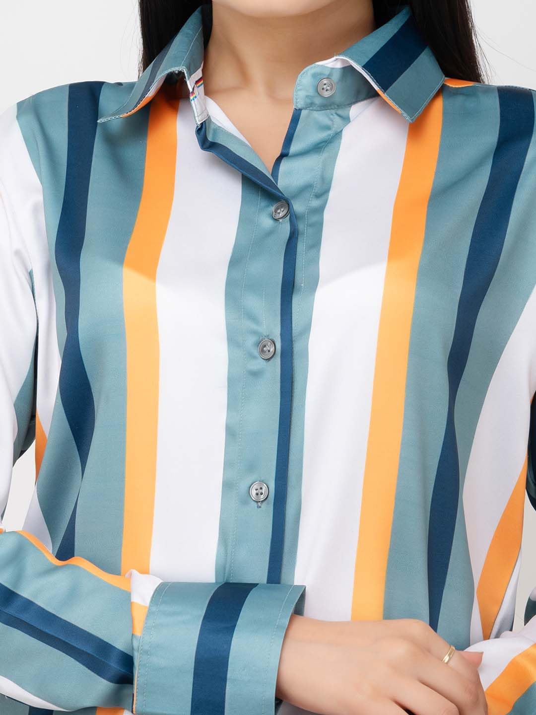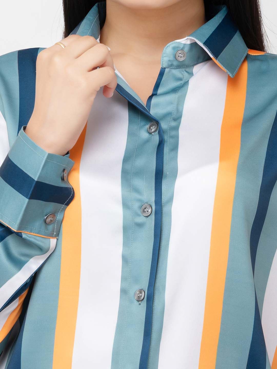 Pattern: Vertical stripes in various colors including teal, orange, white, and a muted green.Collar: Standard pointed collar, giving it a classic and formal look.Buttons: The shirt features a full button-down front with clear or matching buttons, typical of dress shirts.Sleeves: Long sleeves with buttoned cuffs, allowing for a polished or more relaxed style depending on how they’re worn.
