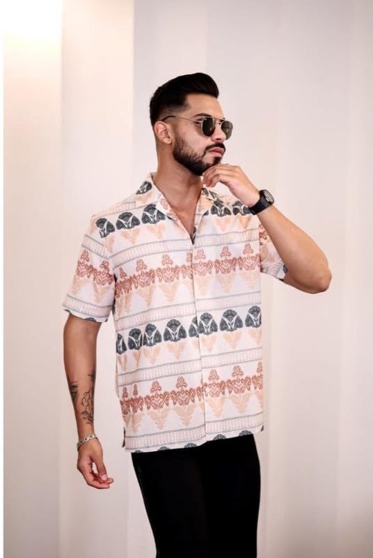 Men’s Polyester Printed Half Sleeve Shirt, Color: Cream Orange, Material: Polyester, Size: 2XL, Pattern: Printed, Sleeve Type: Half Sleeve, Type: Shirt, Disclaimer: The color of actual product may vary slightly from the images provided due to photographic lighting conditions and difference in screen resolutions.
