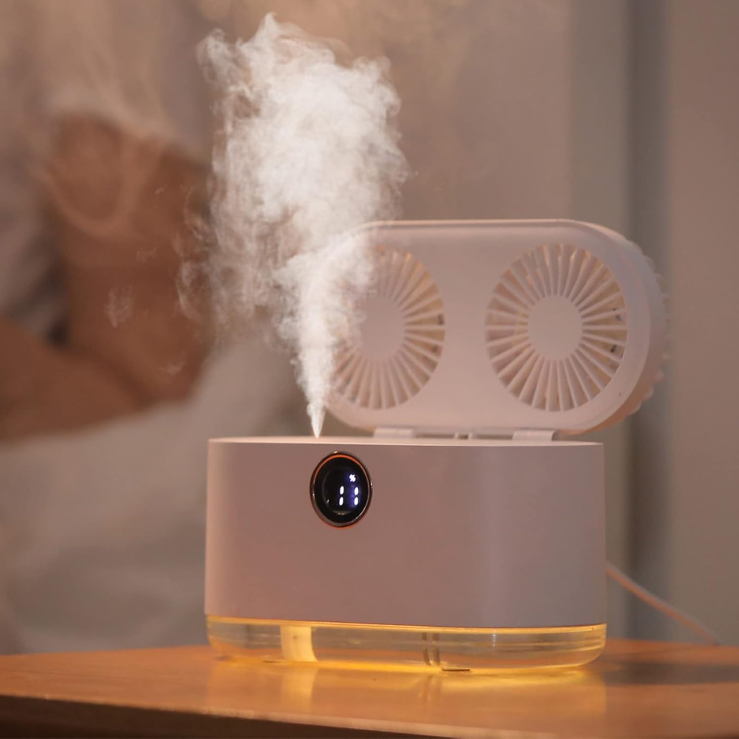 Upgrade your cooling experience with this Double-Head Mini Air Conditioner Fan, featuring dual fan heads and water mist technology for a powerful cooling effect. The built-in humidifier maintains optimal moisture levels, preventing dryness. Its adjustable 3-speed airflow ensures personalized comfort, while the soft LED night light adds a cozy touch to any space. With an intelligent digital display, you can easily control all functions at a glance. Designed for portability, this USB-powered air cooler is perfect for home, office, bedside, or travel. Stay cool, refreshed, and comfortable all day long!