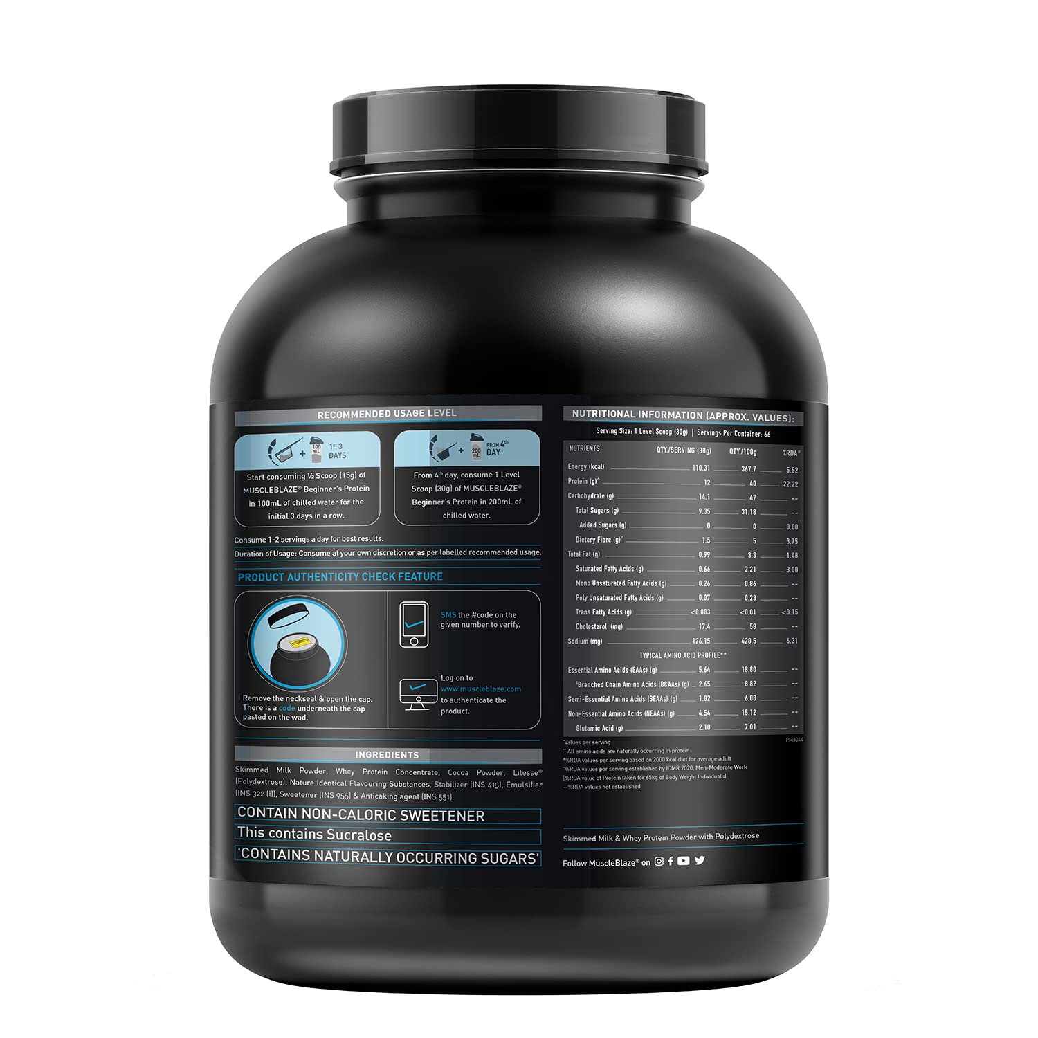 MuscleBlaze Beginner’s Protein delivers 12 g protein in each serving. It contains the finest quality whey protein concentrate which is ideal for beginners and helps them to adjust with the increased macro-nutrient intake plan & meet daily protein requirements.