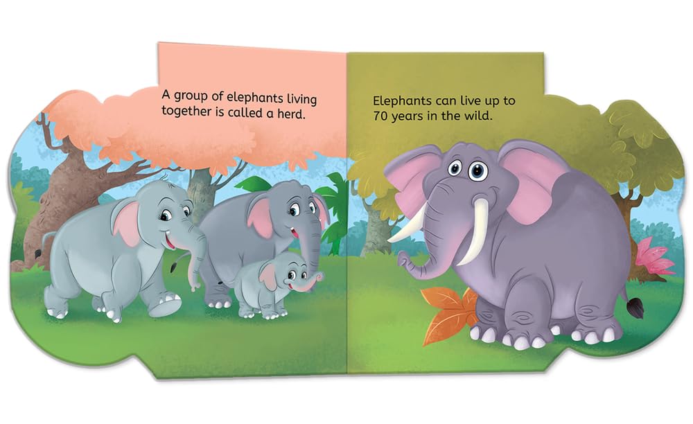 Elephants, the largest land animals, are a sight to behold. These gentle giants are friendly and live in large groups. My First Shaped Board Book familiarizes young learners with their habitat and distinct characterstics. Gorgeous illustrations and simple sentences in this book instill a love for reading among early beginners.