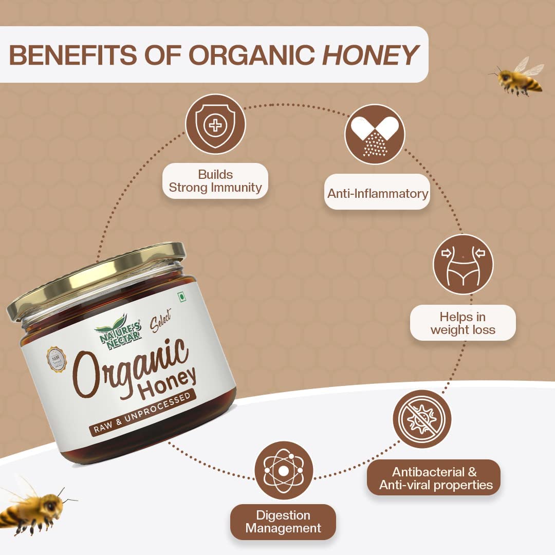 This Raw & Unprocessed Organic Honey from Nature’s Nectar is produced through sustainable beekeeping practices. Our professional beekeepers follow guidelines for organic honey production and extraction in more synergy with the environment around them.