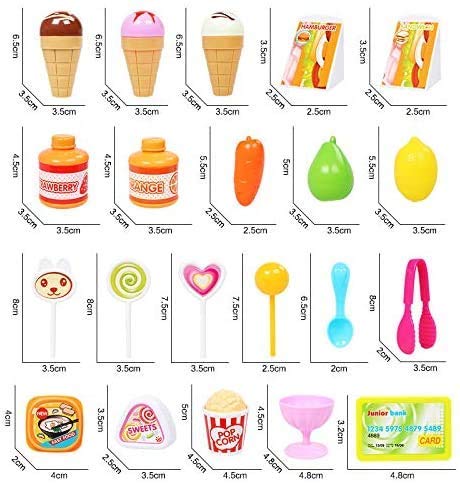 Mini Home Super Market : Perfect starter supermarket play set, comes complete with a wide variety of food items, from fruits and veggies to snacks and dessert making a total of 33 items. Children love pretend-play. They love to enact different activities like cooking, playing doctor, acting like super-heroes. This is a fun to play supermarket set for children. Size: 38.5 x 37 x 20cm. Made up of child safe material. Realistic Design : This toy set has a counter with shelves for keeping products and a cart. Many Accessories includes 33 Accessories and Colorful Stickers for Complete Supermarket Experience. This set comes with lots of accessories like Ice Cream, sweets, food. Early Development : Helps in Improving Cognition Creates Curiosity Mental Development Decision Making Colour Recognition Object Identification and much more. Learning Outcome : Get your pre-kindergarten kid a supermarket play set for a fun, learning play time and a direct objective towards teaching the usage of everyday tools and supplies. Allows your kids to perform certain tasks, which help to develop basic living skills, improve creativity and critical thinking abilities, etc. This pretend and play set allows children to pretend how to be a cashier in real life. Educate children with ideas of how groceries stores works while having fun! Engaging & Built to Last : The toy parts are manufactured with top quality materials and components, which are non-easily broken or dented. Package Contents : It includes various food items including pretend play candies, ice creams, lollipops, popcorn, spoons and bowls along with a pretty display counter with priced racks to simulate a complete shopping mart.