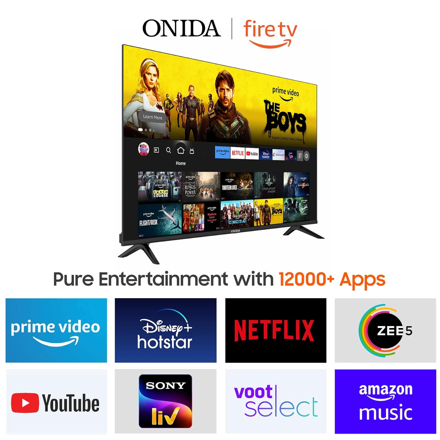 Powered by Fire OS , the Onida Fire TV provides access to more than 12000+ apps from the Fire TV App Store. Enjoy your favourite content from a wide range of platforms such as Prime Video, Netflix, Disney+ Hotstar, ZEE5, SonyLIV, YouTube, Apple TV, and more.