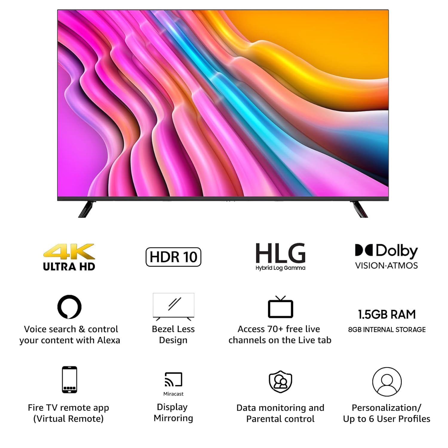Fire TV Built-In | Voice Remote with Alexa | DTH Set-Top Box Integration to switch between DTH TV Channels & OTT apps | Display Mirroring – Mira Cast | 70+ free live channels on the Live tab | Personalization – up to 6 user profiles | Data Monitoring | Supported Apps : Prime Video, Netflix, YouTube, Disney+ Hotstar and more | 12000+ apps on the Fire TV Appstore | 2.0 GHz Multicore processor | 1.5GB RAM + 8GB Internal Storage | 178 Degress wide-view display panel
