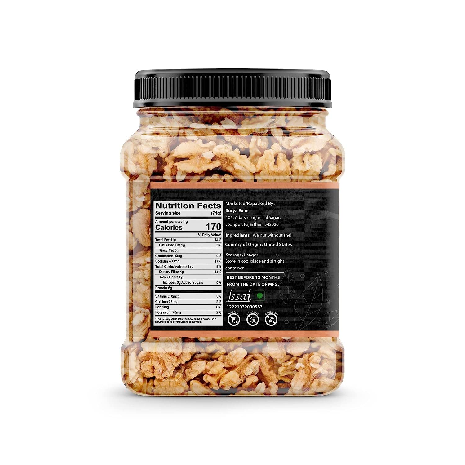 Good source of vitamin e and omega-3 fats. Supports brain health. Storage information- keep it cool and dry place.; 100 percent natural nuts, good for an active life style, perfect for snacking low calorie nut, low sodium, ideal for weight watchers
