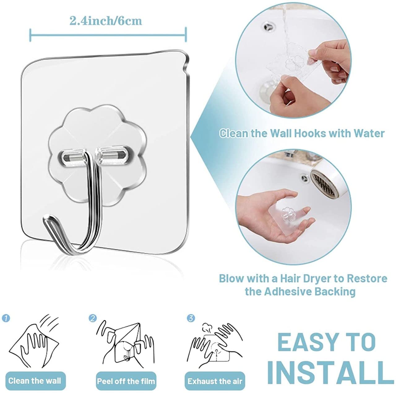 EASY TO USE | HOOKS FOR WALL WITHOUT DRILLING : Stick clear adhesive hooks easily to clean and reposition without surface damage, no need to nail and drill the wall. You can utilize wall hooks as hangers for wall repeatedly after cleaning and dry. These wall hooks for hanging strong and can surely hold your accessories in place on any surface. Good adhesive hooks for wall like command hooks are never enough.