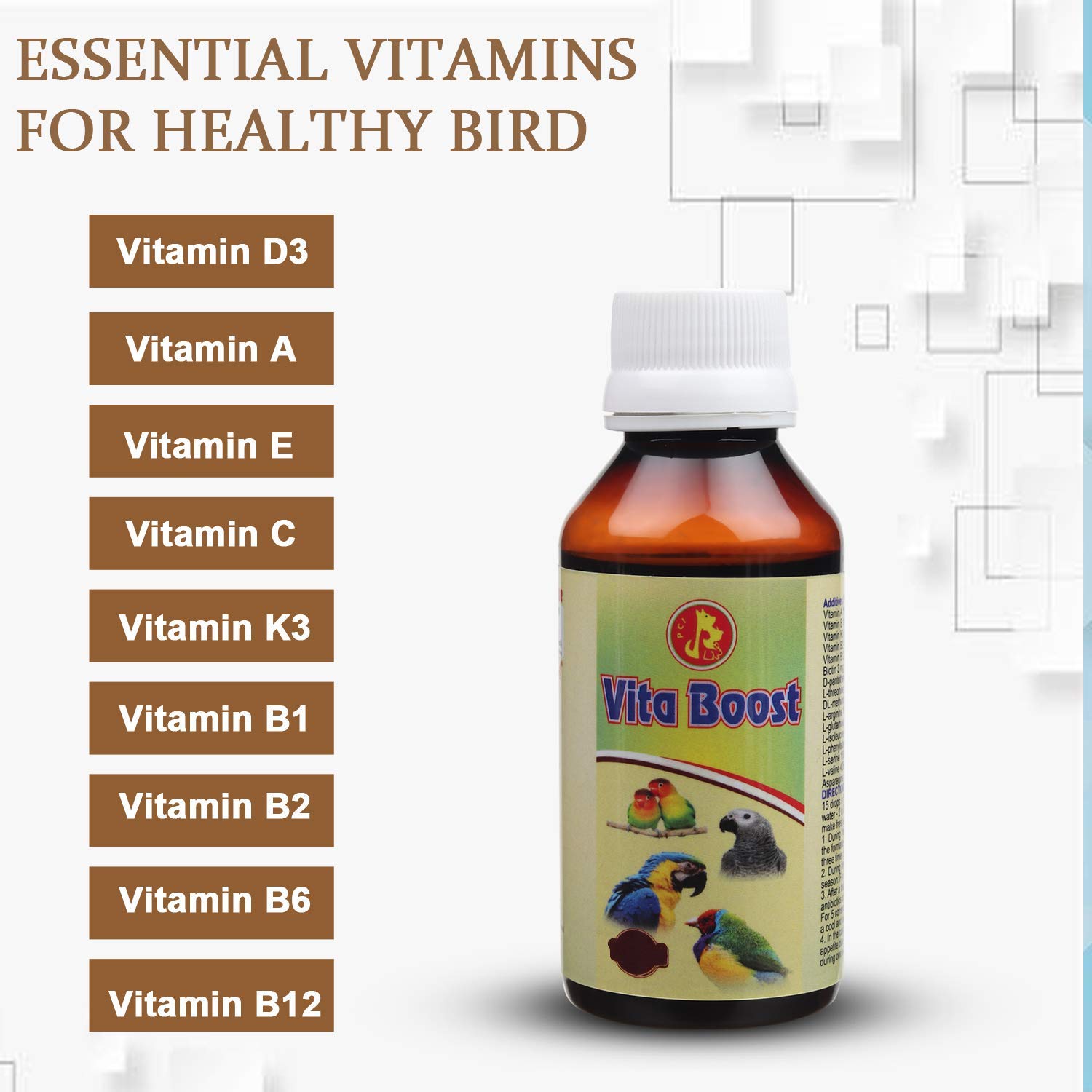 Vita Boost – Provide Essential Vitamins for Breeding & Healthy Growth. Rich in Vitamin A. Pet birds that only eat seeds (especially sunflower seeds and peanuts) are deficient in Vitamin A, thus highly need this supplement.