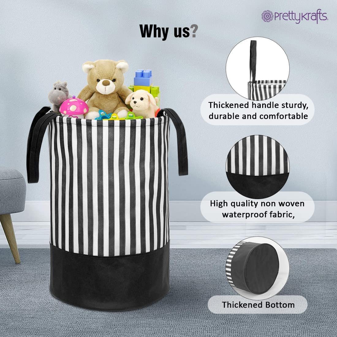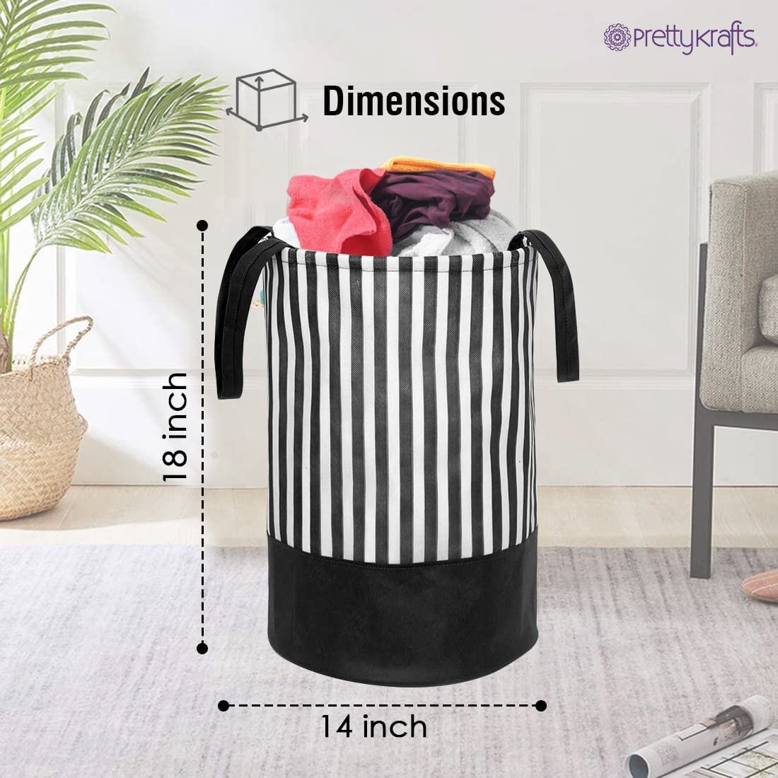PrettyKrafts 45L Non Woven Stripe Printed Round Foldable Large Laundry Bag/Basket With Lid & Handles, Freestanding Clothes Storage Organizer for Bedroom, Bathroom, Dorm (36x36x45cm, Black, Set of 1)