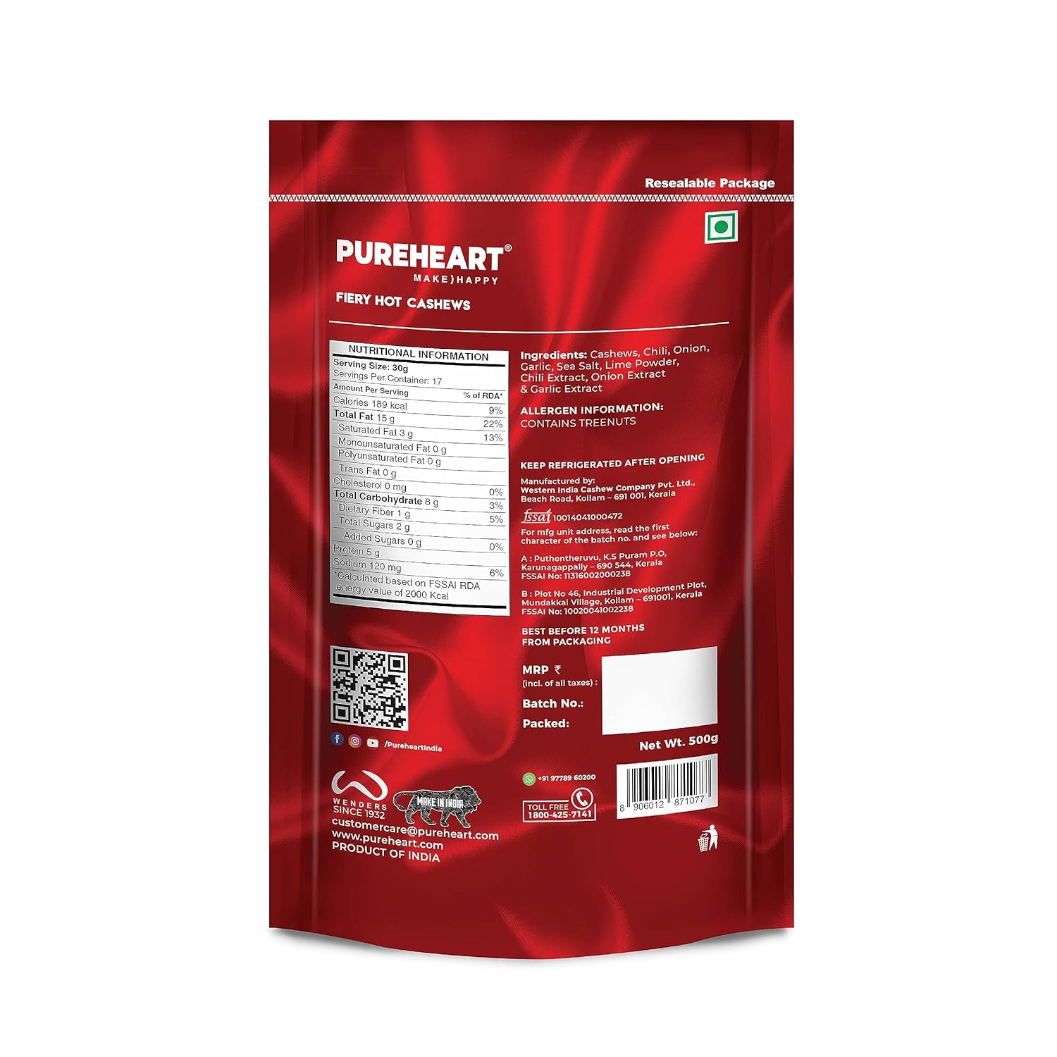 Pureheart Nutreat Fiery Hot Cashews (500 gm), Premium Spicy Roasted Masala Cashew Nuts/Kaju Dry Fruit | Protein & Fiber Rich Chili Cashews| Crunchy Snack | No Artificial Colors, Flavors, Preservatives