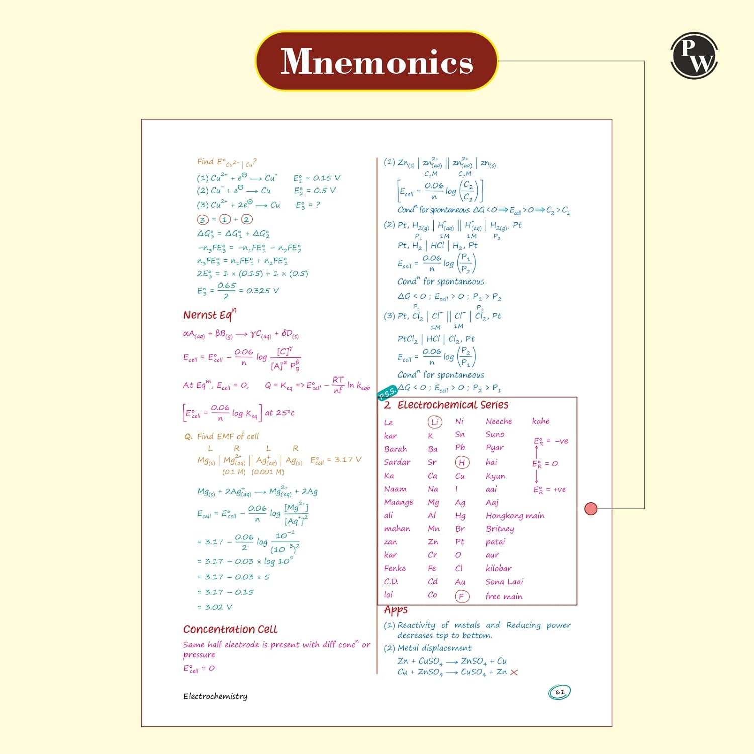What sets this book apart?Formulas: It simplifies complex concepts of Chemistry by breaking them down into easy-to-understand equations.Mnemonics: The notes employ memory-enhancing mnemonics, making it simpler to retain important facts and thus reducing the burden of memorization.Important Examples: Indicate the practical applications of the content through questions-solutions make the subject matter more relatable and facilitates a better understanding of the material.Special Tips and Tricks: Throughout the notes, you’ll discover exclusive tips and tricks. These gems of knowledge can help you save time and effort, providing shortcuts, problem-solving techniques, and valuable insights to enhance your exam performance and practical skills.