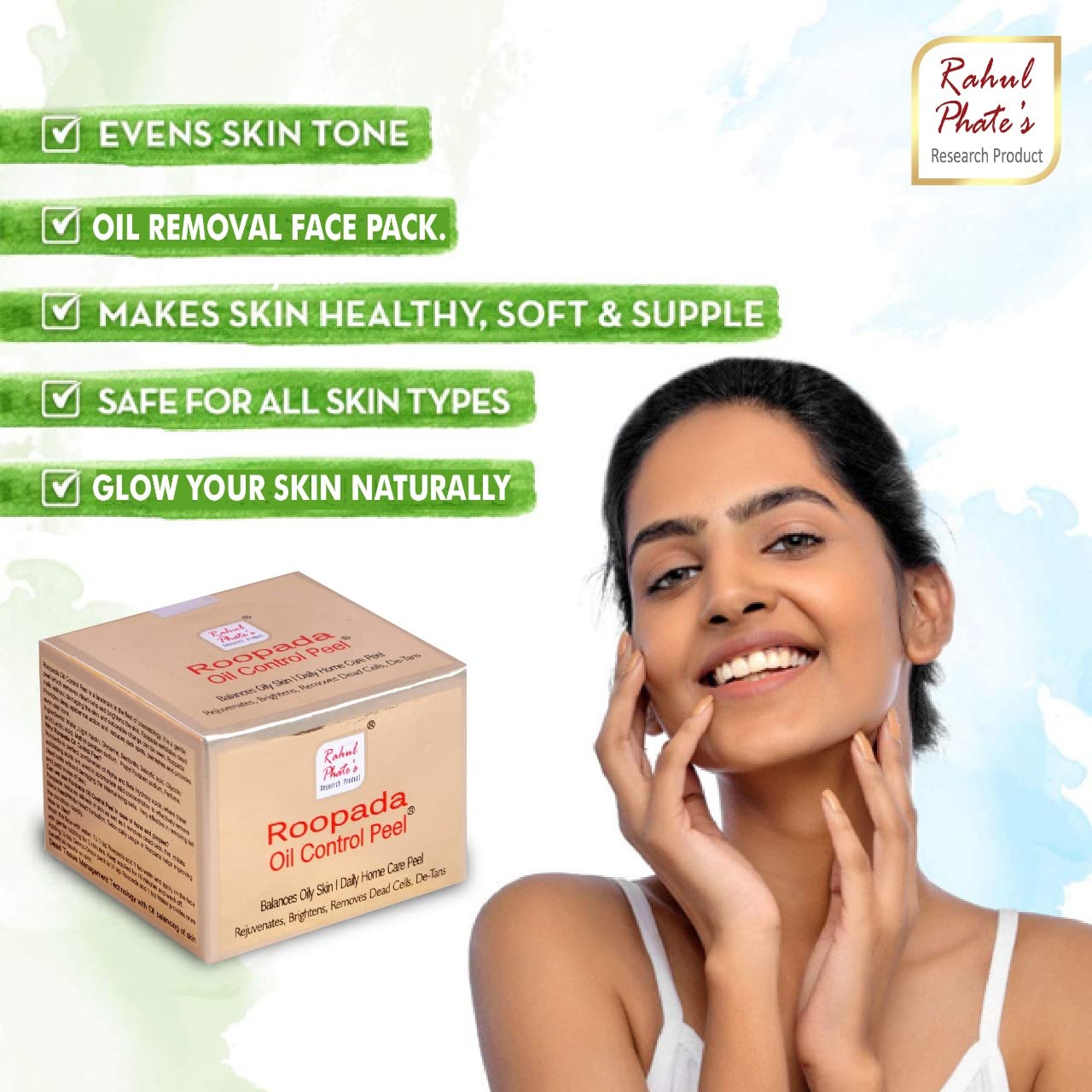 Rahul Phate, Roopada Oil Control Peel, even works as De-tan pack, Fine line control pack, Dark patchiness and tan reducing pack, Gentle exfoliating, dead cell remover pack, Oil Control peel for Men, Skin Firming pack for women, Acne care pack for Teenagers and youth, De-Tan pack for all types of skin.