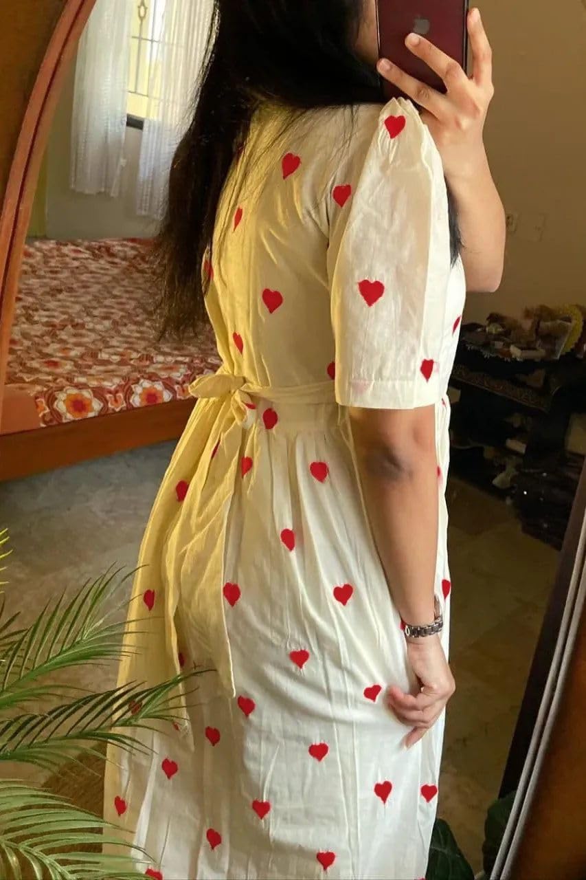 Review: Quality of product is not good. Red colour dye used for the heart design in the dress has released to white part of the dress after wash