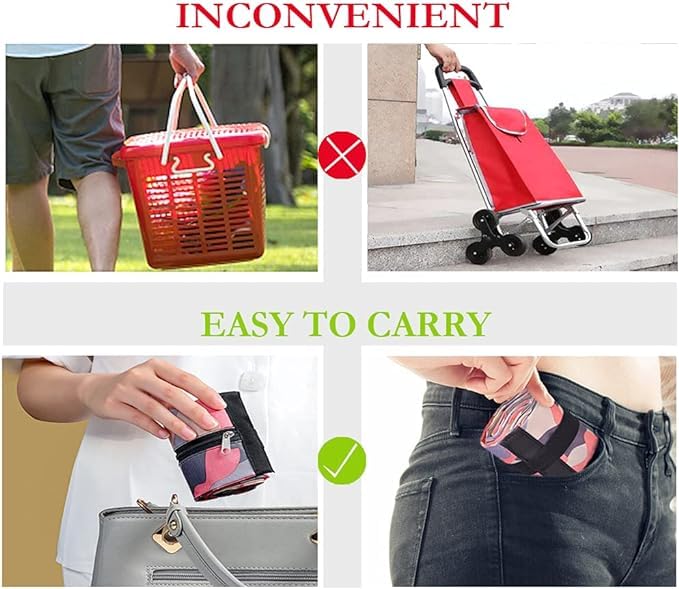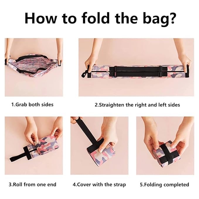 HIGH QUALITY FABRIC: High quality waterproof fabric design, machine washable, easy to clean, quick drying. ELASTIC BANDAGE: Elastic bandage design, convenient storage, fast storage, does not occupy space. SHOULDER BUCKLE DESIGN: The design of shoulder strap buckle can adjust the length freely for easy use. FEATURES: POLYESTER MATERIAL: Wear-resistant and durable, you don’t need to worry about break or cracking while using it , and can toss the cloth shopping bags right into the washer and save your time. QUALITY FASTENER: Freely adjustable to be used by shoudler/hand, you can use it as totes by hands , or shoulder bags by shoudlers . it’s practical for daily use such as shopping, picnic, travel, or as a gift to friends. ELASTIC BAND: Stay flexible after repeatedly used, you can fasten the folded bags quickly to prevent it from becoming loose and taking up space. ENVIRONMENT FRIENDLY: When you use this reusable bag, you will reduce the use of multiple plastic bags every week; while the strong and beautifully designed bag optimizes your shopping experience, it also helps you contribute to the protection of the ecological environment. FOLDING STEPS: STEP 1: Pull both sides STEP 2: Straighten to the left and right sides STEP 3: Roll from one end STEP 4: Cover with the elastic band STEP 5: Folding completed