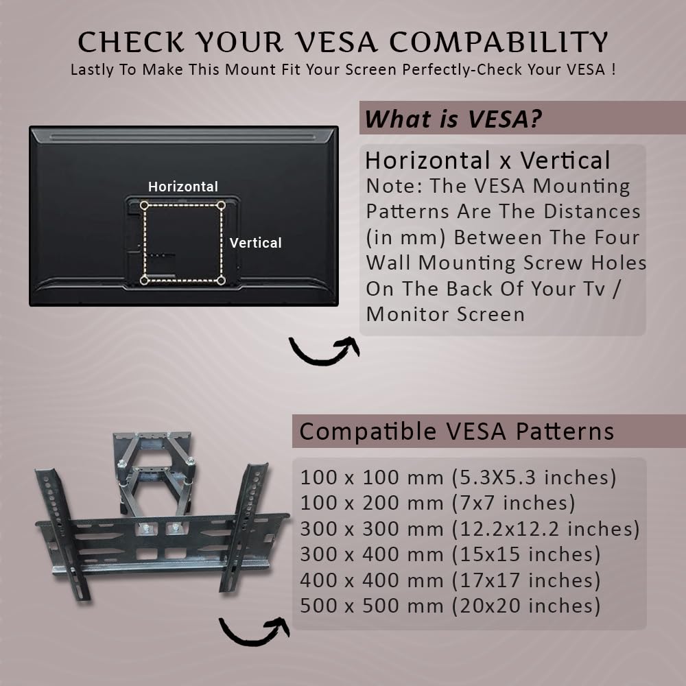 Designed & built considering the delicacy of LCD, PLASMA & LED TVs. Suitable for 32- 55″ LCD, LED, Monitor TV. VESA Size Compliance: 100 x 100 mm, 200 x 200 mm, 200 x 400 mm, 300 x 300 mm, 400 X 400 mm.