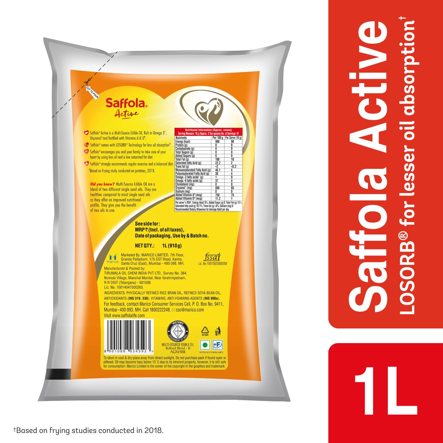 Saffola Active Refined Cooking oil | Rich in Omega 3 & Oryzanol | Multi-Source Edible Rice Bran & SoyaBean oil | 1 Litre pouch