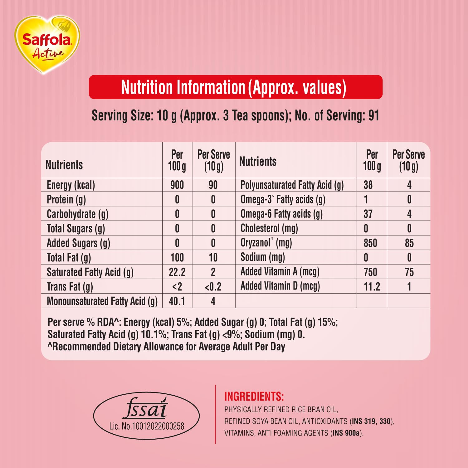 Saffola Active blended edible oil is rich in Omega-3 and heart healthy Oryzanol.