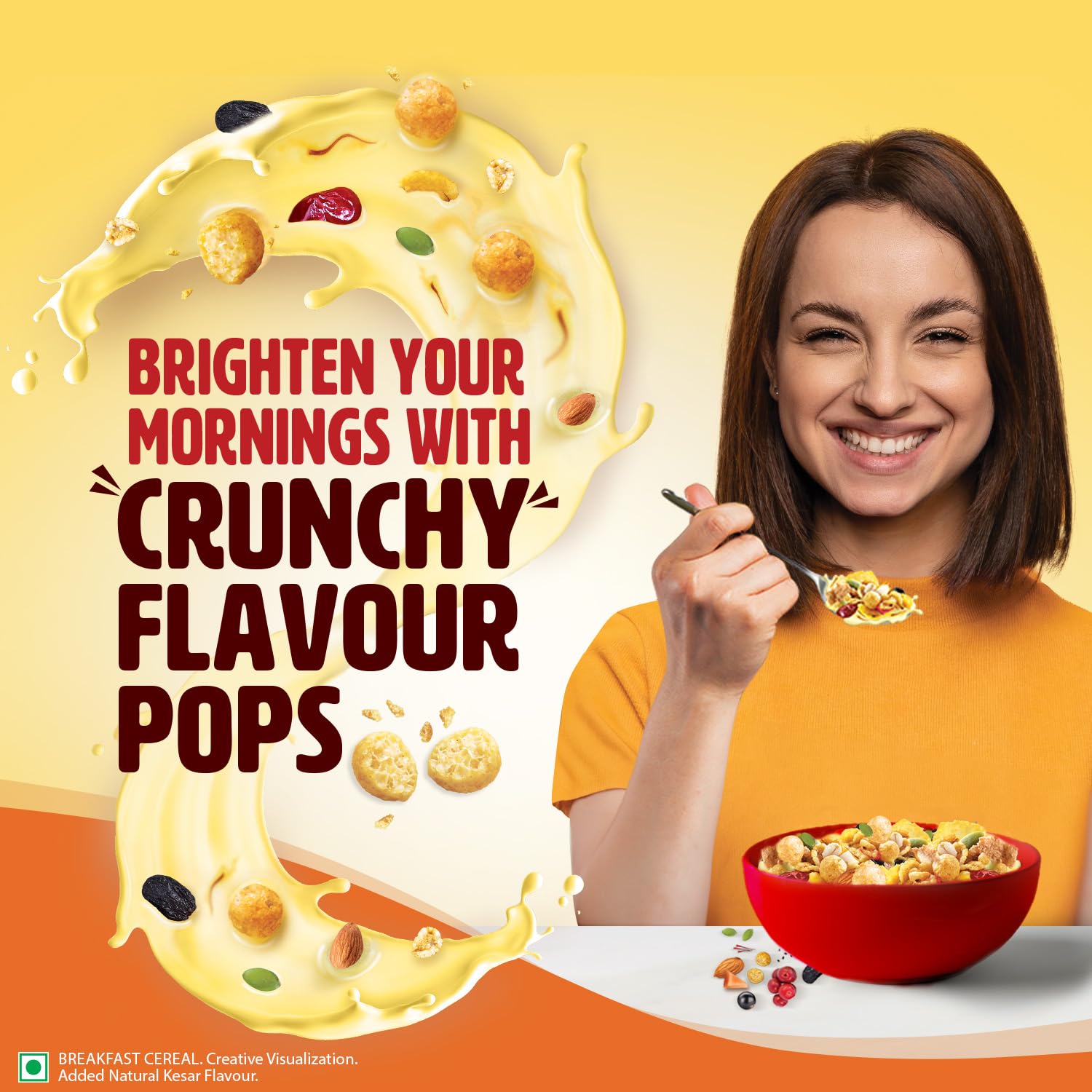 Review: * Has a nice Kesar Flavour* It turns the milk light yellow, like that of Kesar.* Is a perfect addition to breakfast, makes my mood happy* It is so tasty that it makes me excited to have my breakfast and start my day on a happy note/is the right start to the day!* It remains crunchy even till the last bite/remains crunchy even when i have it with warm milk* Has interesting crunchy flavour pops coated with kesar flavour that gives a burst of flavour and crunch to every bite* Has 15 in 1 ingredients – like kesar, chia seeds, pumpkin seeds, cranberry, black currants, almonds, black raisins etc* It has all good ingredients (15 in 1) and is free from the bad ingredients* No Maida, No Palm Oil, No Preservatives, No Artificial Colours