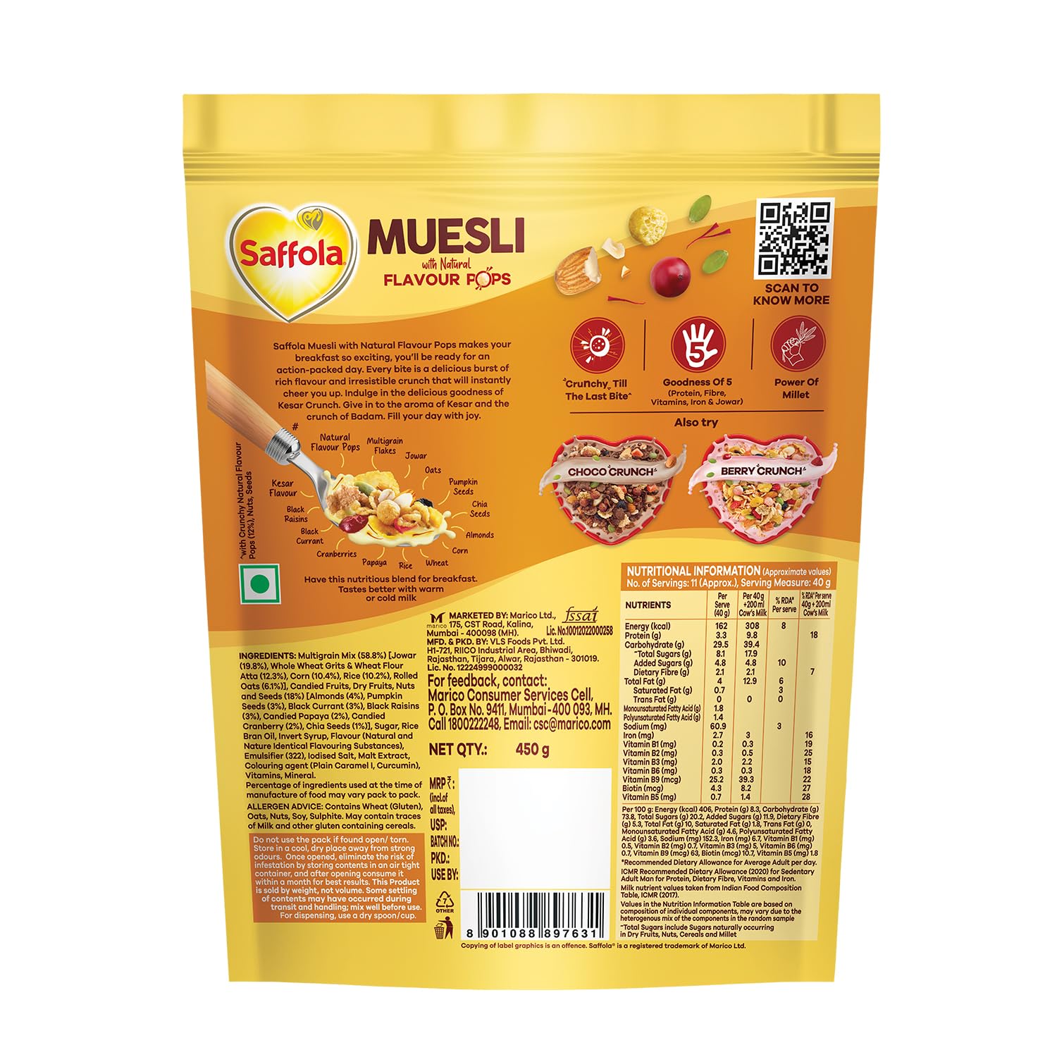 Saffola Muesli Kesar Crunch with Flavour Pops, 450 gm | 15 in 1 Fruit and Nuts, Seeds, Millet & more | Cereals for breakfast with wholegrain, protein, fibre