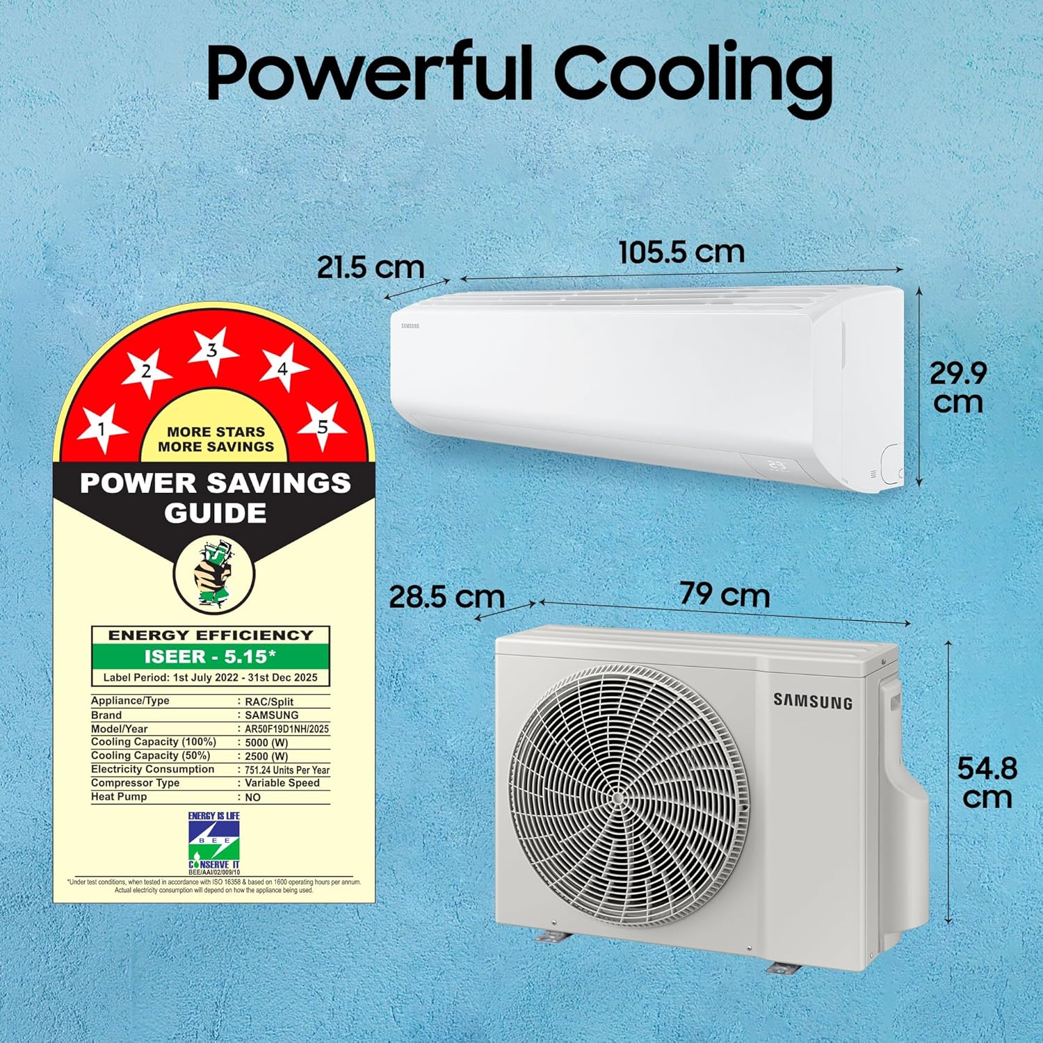 Samsung 1.5 Ton 5 Star AI Inverter Smart Split AC (WiFi, Energy Saving, Voice Control, Powerful Cooling, Copper, Digital Inverter, 4 Way swing, 5 Step Convertible, 2025 Model BESPOKE AI AR50F19D1NH)