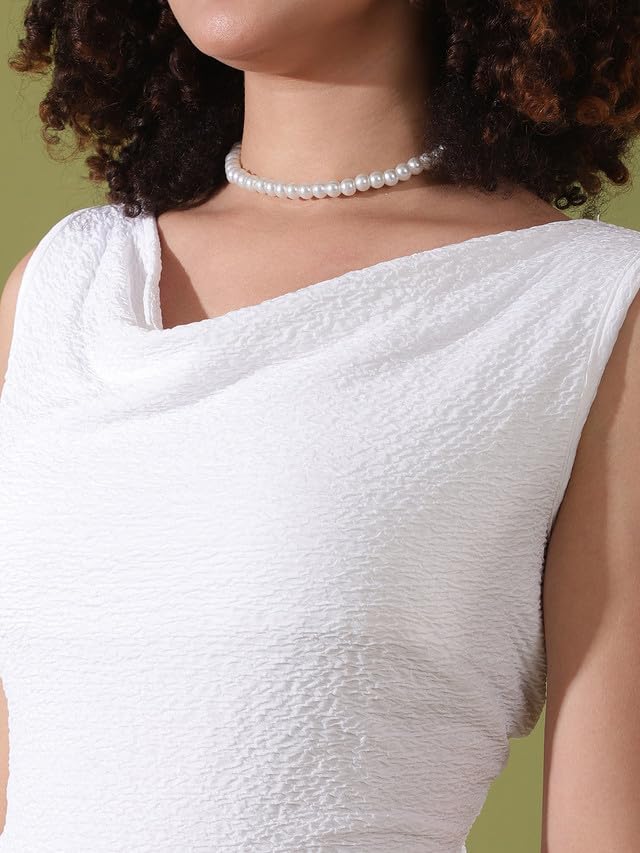 This Dress Is Made of Selvia Fabric, Crafted for Every Comfort. This Selvia Bodycon Sleeveless Solid Work White Color Cowl Neck Dress Dress to Make It Suitable For Daily Party or Evening Wear.