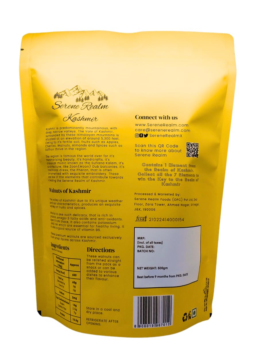 Review: I recently purchased the Serene Realm Kashmiri Walnuts, and they exceeded my expectations in every way. The quality of the walnuts is exceptionalâthey are fresh, crunchy, and full of flavor. Each piece is uniformly shelled, making them perfect for snacking or adding to recipes.What sets these walnuts apart is their rich, buttery taste, which is a testament to their premium quality. They arrived well-packaged, ensuring their freshness was preserved. I’ve tried many brands before, but Serene Realm stands out for its superior taste and texture.Overall, I highly recommend Serene Realm Kashmiri Walnuts for anyone looking for high-quality, delicious walnuts. I will definitely be purchasing them again!