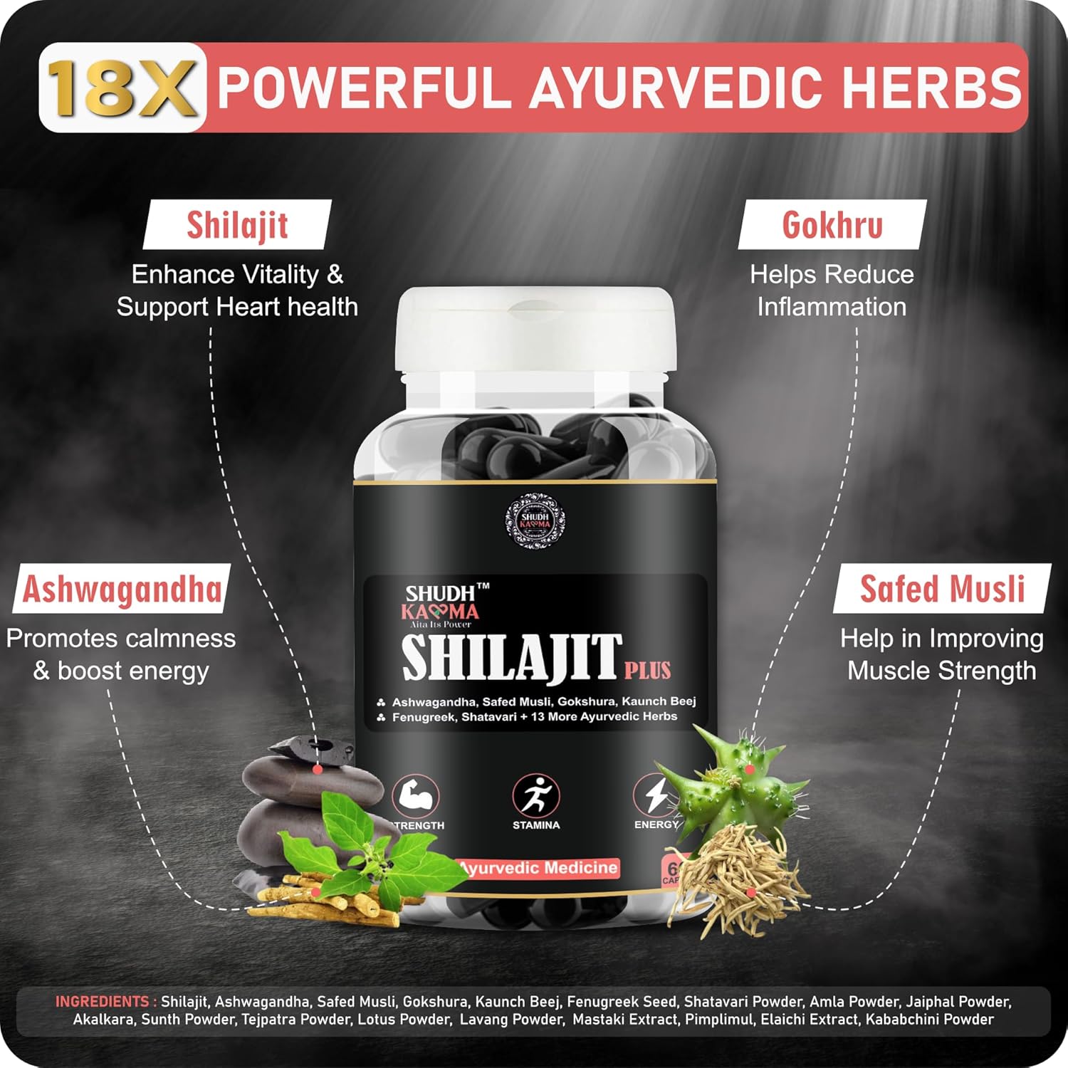 Shilajit Plus Ayurvedic Supplement with 18 Herbs including Shilajit, Ashwagandha and Safed Musli for Strength & Stamina – 180 Capsules
