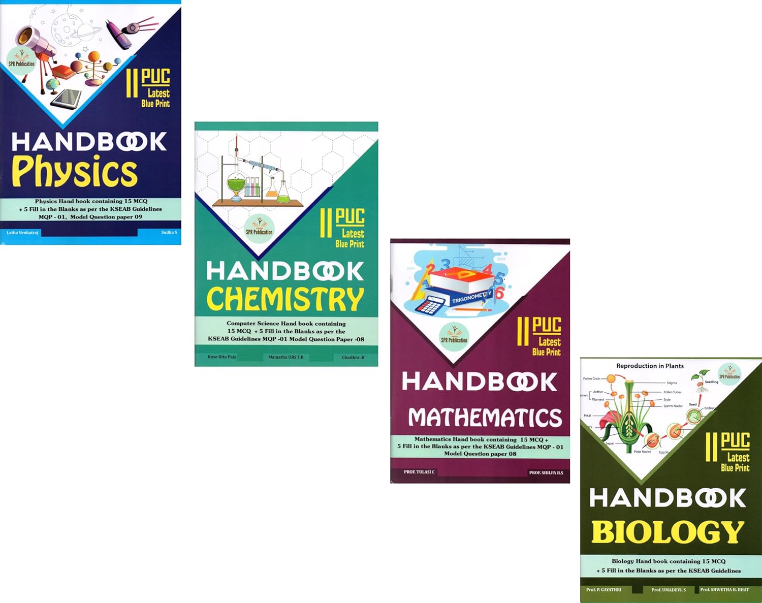 SPR 2nd PUC Handbook – PHYSICS + CHEMISTRY + MATHEMATICS + BIOLOGY|Set Of 4 Books|15 MCQ + 5 Fill In The Blanks – 10 Solved Model Papers|As Per The KSERB Guidelines|