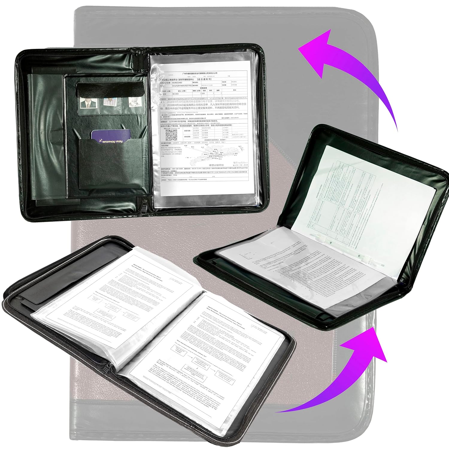 Made of PU Leather. The inside pockets neatly organize your personal accessories (e.g. credit / business cards, writing notepad, envelopes, letter, correction pens, coins, receipts, desk pads, filing work note, workspace planner, driver’s license, visa papers, mailers)