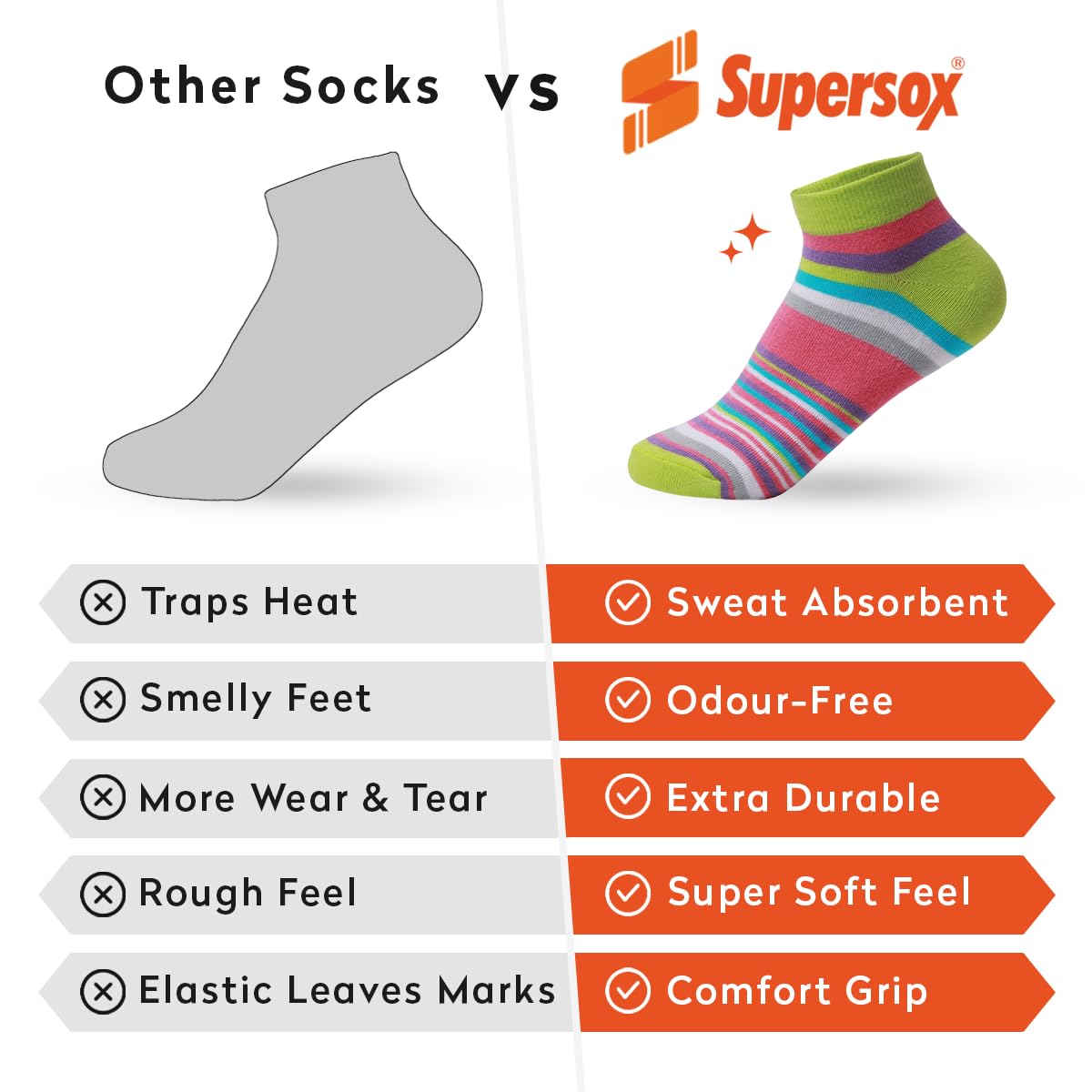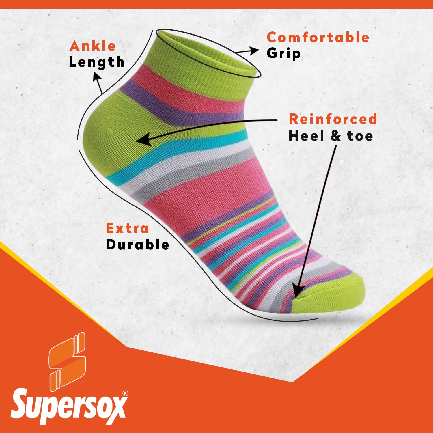 Supersox Ankle Socks for Women Made With Premium Cotton. Stylish Striped Design with Extra Softness, Anti Odour & Anti Bacterial – Free Size, Multicolor