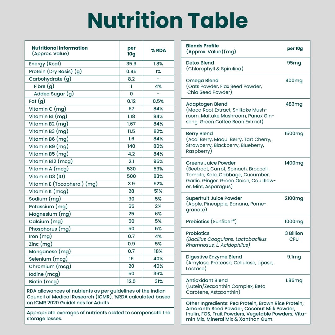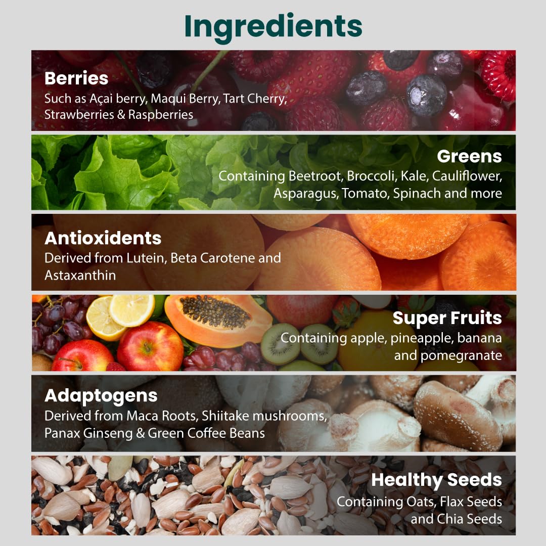 Ingredients: Detox blend, Omage blend, Adaptive blend, Berry blend, Greens juice powder, Super fruit juice powder, Probiotics, Digestive enzyme blend, Antioxidant blend, Pea protein, Brown rice protein, Amaranth seeds powder, Coconut milk powder, FOS, Fruit powder, Vegetable powder, Vitamin mix, Mineral mix & Xanthan gum.