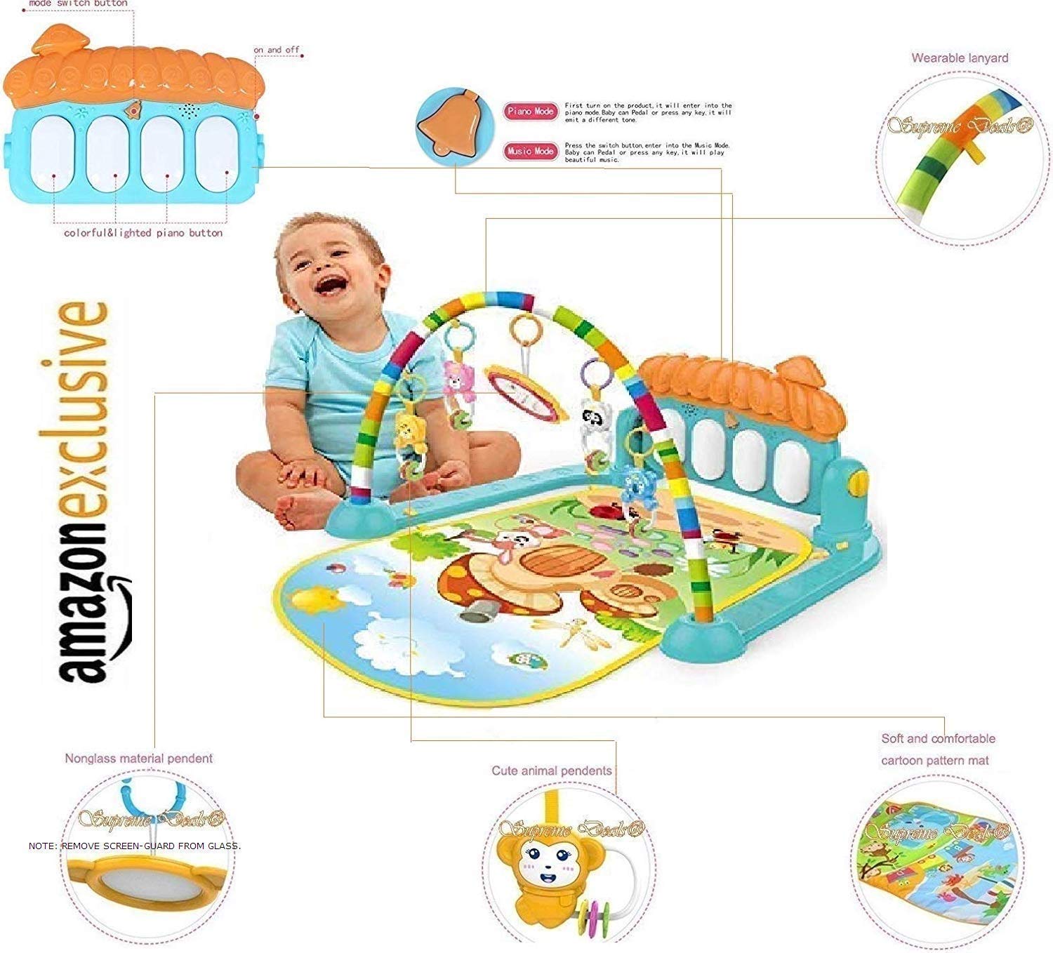 Supreme Deals Musical Keyboard Mat Piano Baby Play Mat Gym & Fitness Rack is a multi-functional rack. Its music rewards the baby as he/she kicks the piano keys and be their ultimate fun partner.