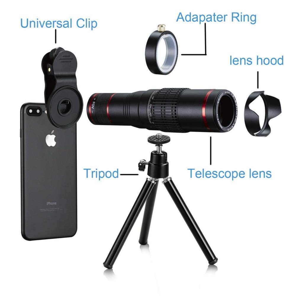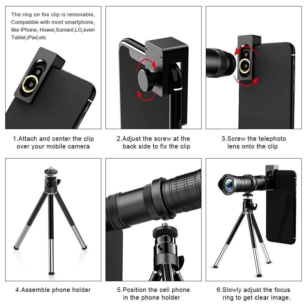 The product includes: telephoto lens, tripod, phone clip, lens clip.
