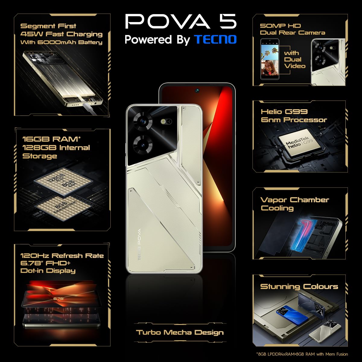 Review: TECNO Pova 5 in the stunning Mecha Black variant, and I must say, I am absolutely thrilled with my decision. This smartphone has exceeded my expectations in multiple aspects, making it a fantastic choice for anyone looking for a feature-packed device.First and foremost, the 8GB of RAM and 128GB of storage provide me with an exceptionally smooth and lag-free experience. Whether I’m multitasking with multiple apps or storing a vast amount of data, this phone handles it all with ease.The standout feature of the TECNO Pova 5 is its remarkable 45W Ultra Fast Charging. It’s a game-changer! No longer do I have to worry about my phone running out of juice during the day. The 6000mAh battery paired with this rapid charging technology ensures that I can go from a low battery to a fully charged phone in no time. This level of convenience is truly unmatched.The camera capabilities of the TECNO Pova 5 are another highlight. The 50MP AI Dual Camera captures stunning photos with impressive detail and clarity. Whether it’s a scenic landscape or a close-up shot, the camera delivers exceptional results, even in low-light conditions.The 3D Textured Design not only adds a touch of elegance to the phone but also provides a comfortable grip. It feels premium in hand and doesn’t slip easily, making it practical for everyday use.The 6.78″ FHD+ Display is a visual treat. It offers vibrant colors, sharpness, and ample screen real estate for an immersive viewing experience. Whether I’m streaming videos, playing games, or browsing the web, the display never fails to impress.In conclusion, the TECNO Pova 5 is a powerhouse of a smartphone that truly stands out in its segment. The combination of a fast-charging battery, impressive camera capabilities, stunning design, and a beautiful display make it a fantastic choice for those who demand top-notch performance and convenience from their mobile device. I am extremely satisfied with my purchase, and I highly recommend the TECNO Pova 5 to anyone in search of a reliable and feature-rich smartphone.