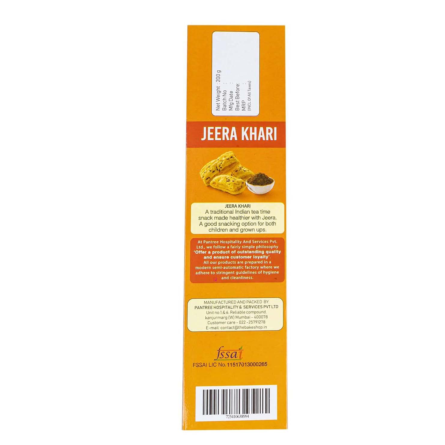PACKAGING : The Jeera khari has been made with hygiene and quality cleanliness under FSSAI norms. The Bake Shop fulfill all the safety standard measeurements.