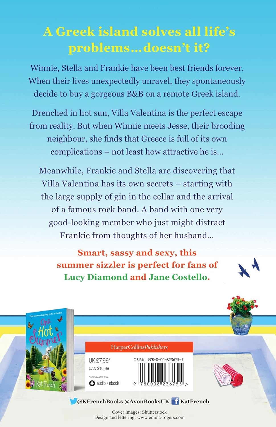 A gorgeous summer read to escape with this summer!A Greek island solves all life’s problems…doesn’t it?Winnie, Stella and Frankie have been best friends forever.When their lives unexpectedly unravel, they spontaneously decide to buy a gorgeous B&B on a remote Greek island. Drenched in hot sun, Villa Valentina is the perfect escape from reality. But when Winnie meets Jesse, their brooding neighbour, she finds that Greece is full of its own complications – not least how attractive he is…Meanwhile, Frankie and Stella are discovering that Villa Valentina has its own secrets – starting with the large supply of gin in the cellar and the arrival of a famous rock band. A band with one very good-looking member who just might distract Frankie from thoughts of her husband…Smart, sassy and sexy, this summer sizzler is perfect for fans of Lucy Diamond and Jane Costello.What others are saying about The Bed and Breakfast on the Beach‘Funny and evocative, refreshing as a G and T – this book is as good as a holiday!’ JANE LINFOOT, author of The Little Wedding Shop by the Sea“Plenty of laughs out loud moments.” Reader review“This is Kat French at her very finest. I loved every minute of this delightful story. I have laughed, swooned, had a few tears, laughed and swooned some more.” Make My Day Books“A delightful story… I was so sad when I reached the end of the tale because I really felt like I had checked into Villa Valentina and really didn’t want my holiday to end.” Turning Pages Opening Doors“Funny, romantic and a really entertaining read… some real laugh out loud moments” Reader review“A lovely. Heartwarming, summery read… I put this book down smiling, a big smile.” Fuel the Blog“Fabulous feel good, fun, compelling read! – Loved it!! Escapism at its very best!!… Would I recommend this book…..Most Definitely…..YES!!!”Dash Fan Book Reviews