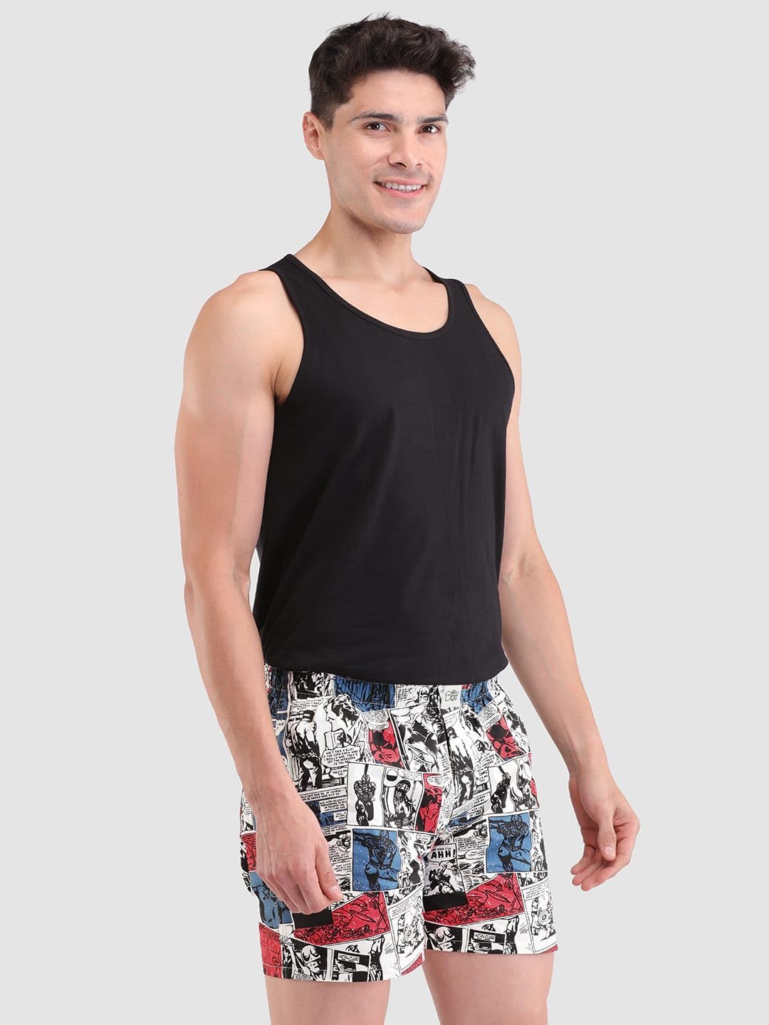 Experience the fun and excitement of your favorite Marvel comics with these vibrant, unisex cotton graphic boxers. Featuring a mid-rise style and a regular fit, these boxers are perfect for adults seeking comfort and style. The comic-inspired pattern and multi-colored design add a touch of whimsy to your wardrobe, making them a great choice for fans of the Avengers. Made from 100% cotton, these boxers are soft and breathable, ensuring all-day comfort. Easy to care for, simply machine wash and tumble dry on low heat. Upgrade your underwear drawer with these Marvel-themed boxers today!
